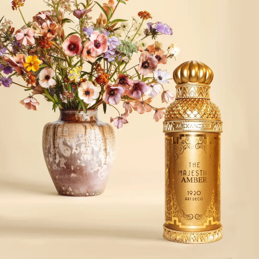 Parfémovaná voda The Majestic Amber Alexandre.J vzdává hold období Art Deco éry, kdy velké parfémové domy začaly vytvářet své první „soliflory“, tedy parfémy vonící převážně nebo pouze po jedné květině. Vůně se otevírá svěžími ovocnými tóny grapefruitu a broskve. Tyto akordy plynule přechází ve vůni růže, která je klíčovou složkou parfému. Základu dominuje lahodná vanilka a sladký karamel s dřevitými tóny pačuli.