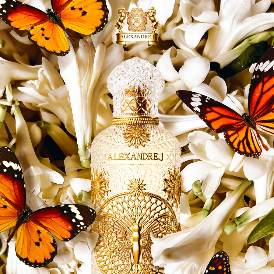 Květinovo pižmová vůně Butterfly z kolekce Art Nouveau značky Alexandre.J symbolizuje transformaci a svobodu. Mísí vzácné ingredience, jako jsou hruška, růžový pepř, tuberóza a neroli. Evokuje pulzující cestu migrujících motýlů a současně je dokonalým znázorněním rozmanitého květinového buketu, který odráží eleganci a sofistikovanost.