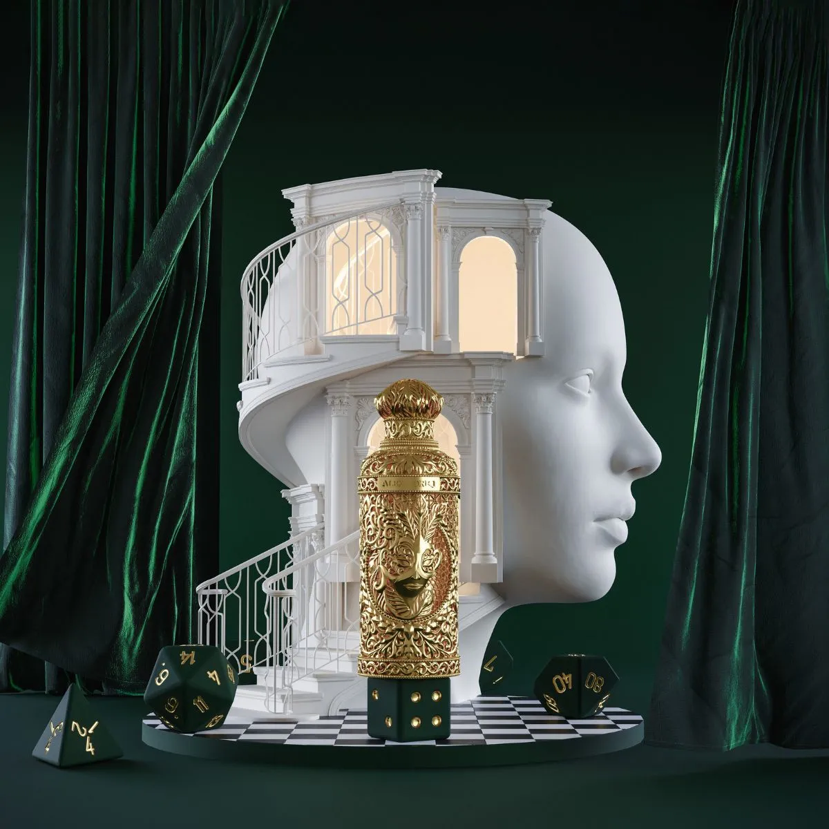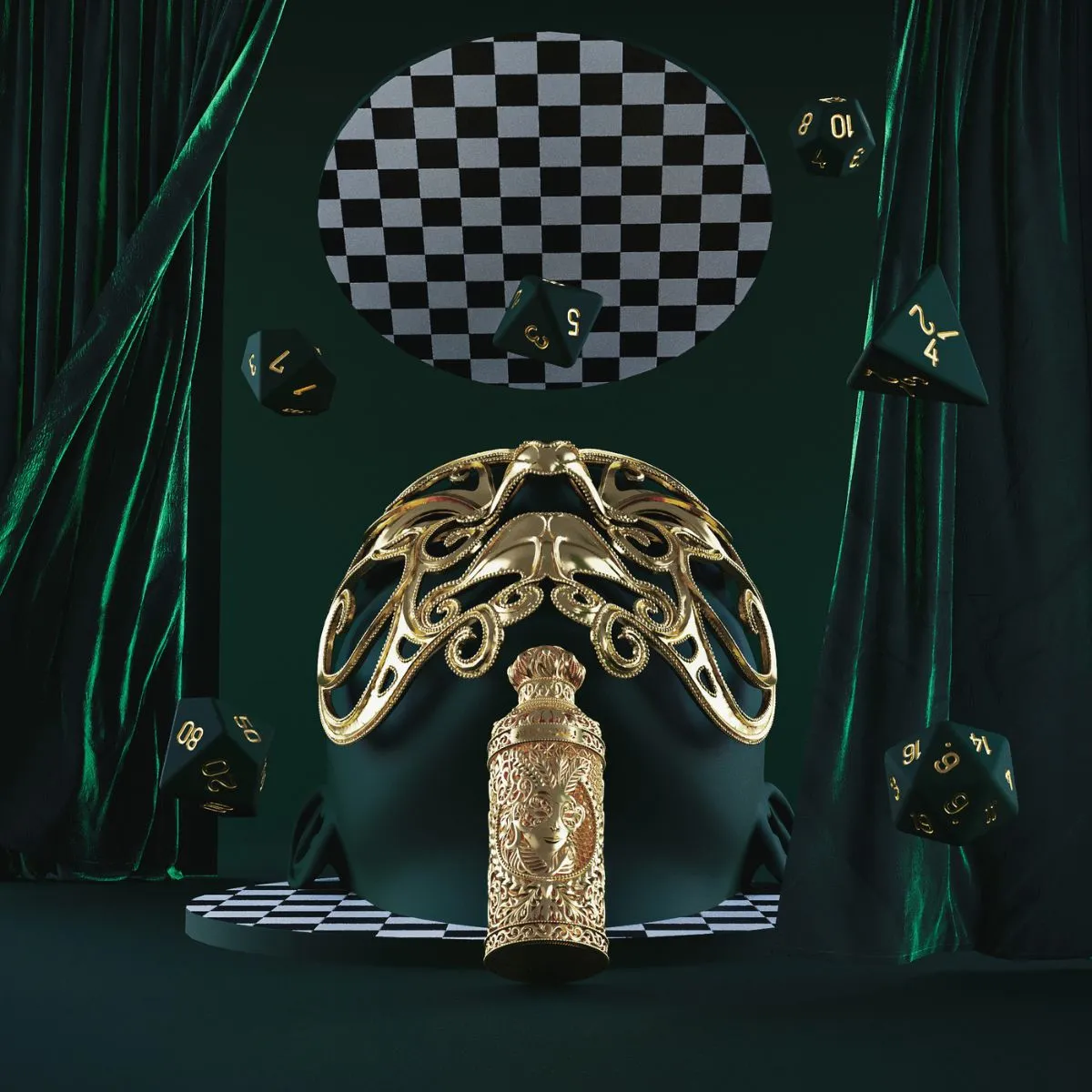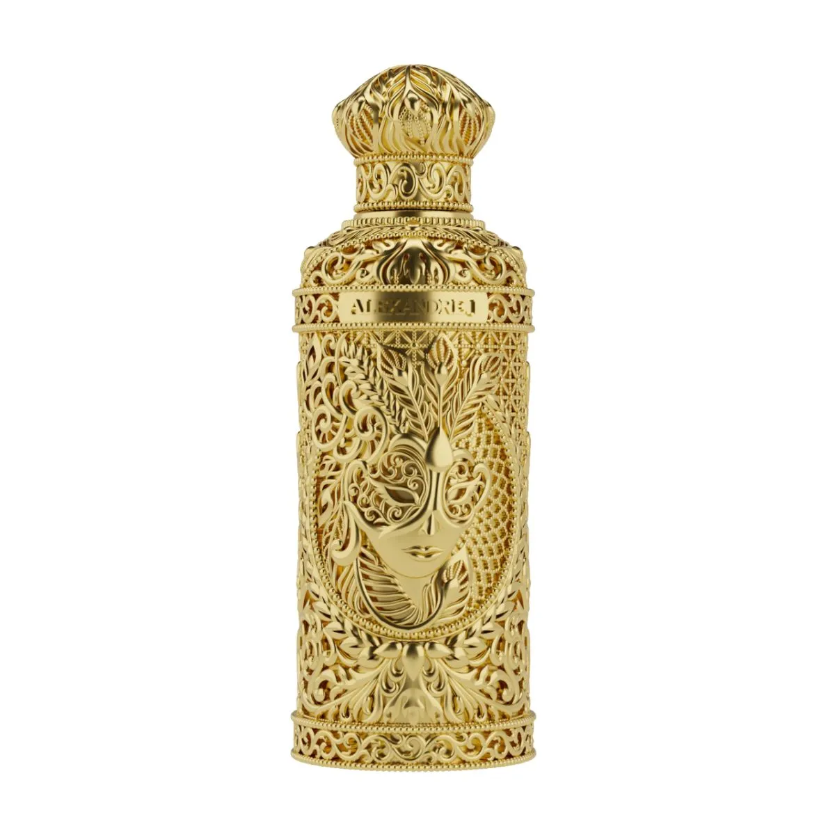 Luxusní krabička z bílé kůže a ručně vyráběný flakon zdobený galvanizovaným zlatem, s maskou v hlavní roli jsou poctou secesního stylu.