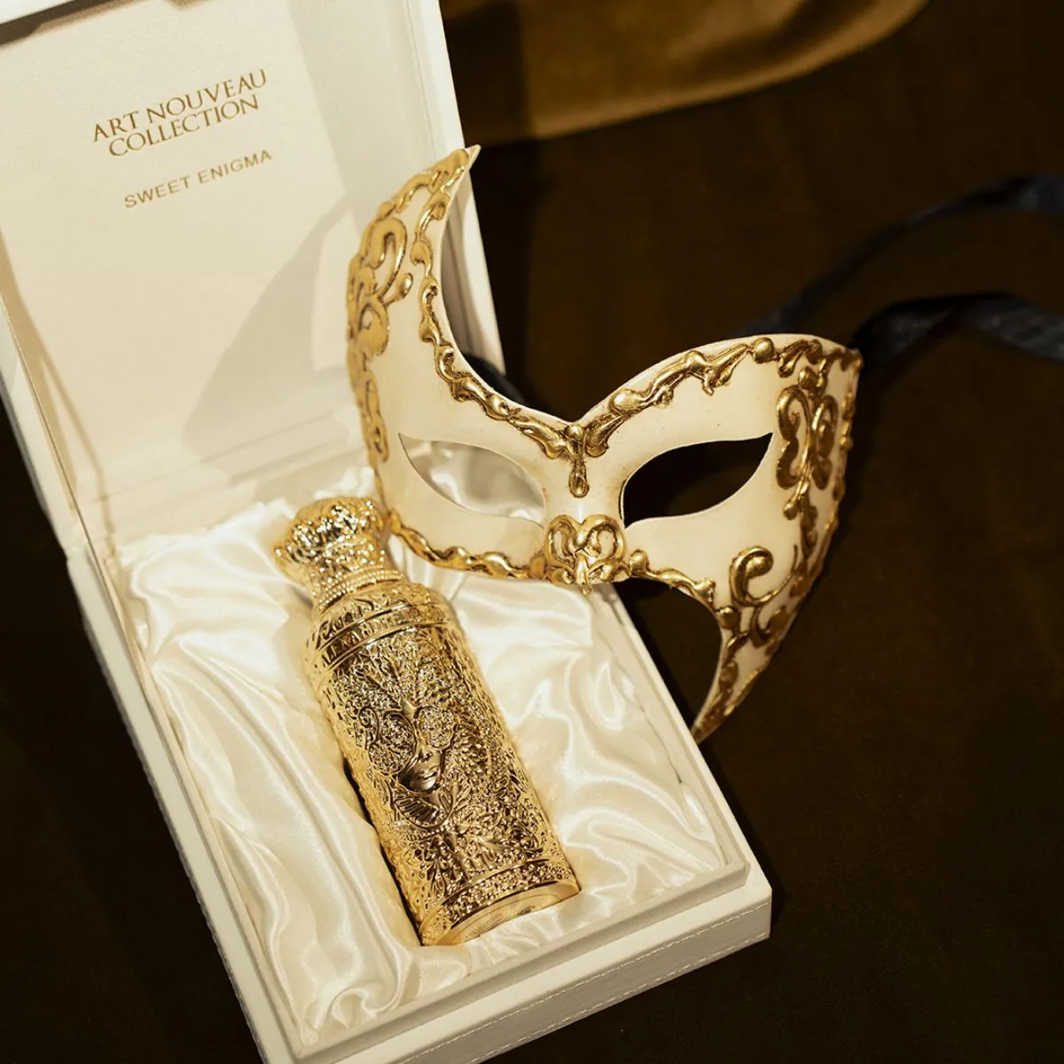 Niche vůně Sweet Enigma vyvolává pocit tajemna a vytříbenosti. Je vhodná pro milovníky vůní, kteří si přejí spíše skrývat než odhalovat. Nadčasový symbol proměny, maska vás zve, abyste přijali neznámé a ponořili se do světa elegance a mystiky. Tato orientální a gurmánská vůně je spíše dámská. Dekor je zdobený galvanizovaným zlatem.