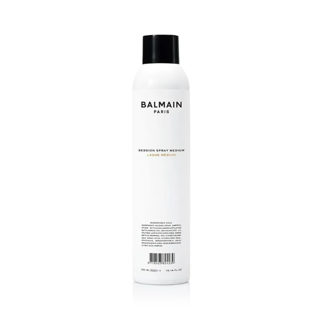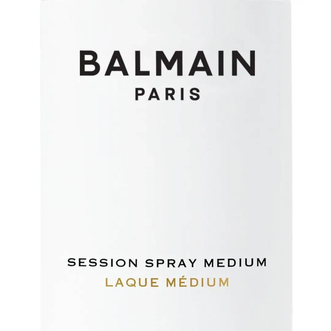 Balmain Session Spray Medium je lehký vlasový sprej, který dodává vlasům poddajnou texturu. Zafixuje účes bez ztuhnutí a zachová přirozený vzhled. Zároveň pomáhá chránit vlasy před vysušujícími účinky slunečního záření.