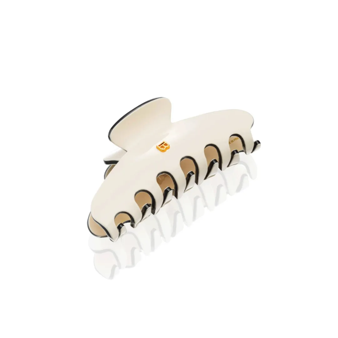 Vysoce kvalitní, ručně vyrobený vlasový klip z odolného acetátu celulózy, zdobený typickým znakem "B" vytvořeným z 14karátového plátkového zlata. Velice pevný, avšak pružný materiál je hypoalergenní a šetrný vůči vlasům i pokožce hlavy.