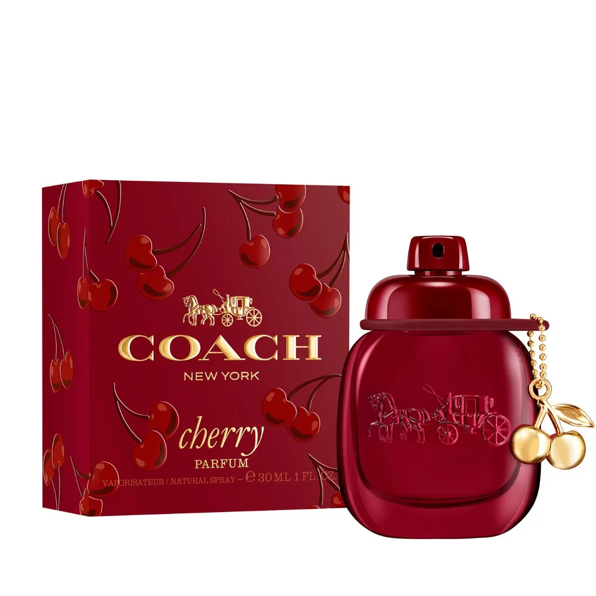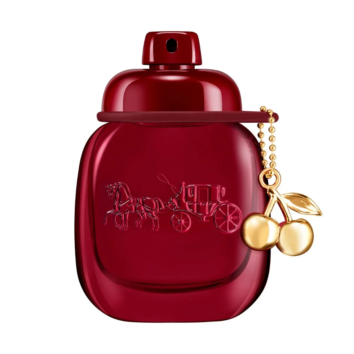 Flakon zdobí intenzivní, lehce transparentní červené lakování. Ikonický přívěsek Coach Fashion ve tvaru třešně je zpracován ve zlatém provedení a slouží jako šperk na flakonu.