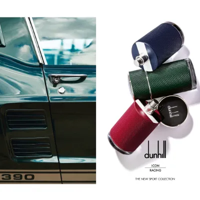 Flakon Icon Racing je inspirovaný strojírenskou technikou rýhování vytvářející texturovaný geometrický vzorek, který byl poprvé použit v roce 1924 na kovových zapalovačích Dunhill. Typická barva – British Racing Green – je spolu se značkou Dunhill již řadu let spojována s historií motorismu.