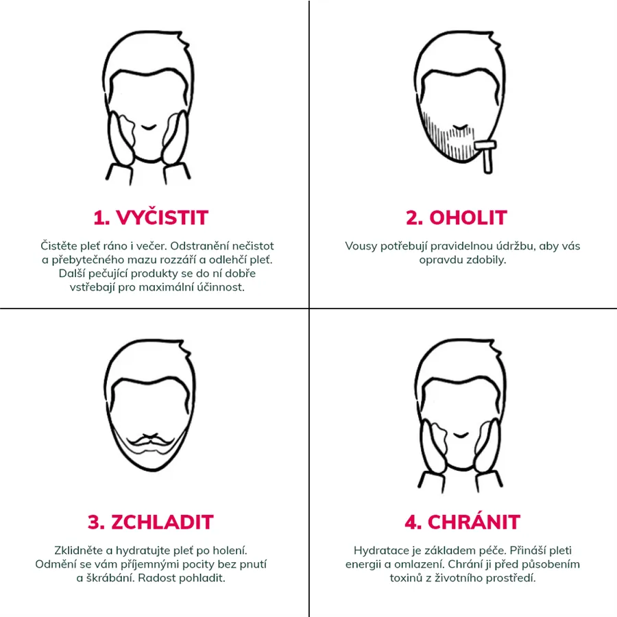 Použití: pár kapek oleje rozetřete mezi dlaněmi a poté vetřete do vousů od stran směrem ke středu, nakonec knír a bradku. Upravte je hřebínkem.