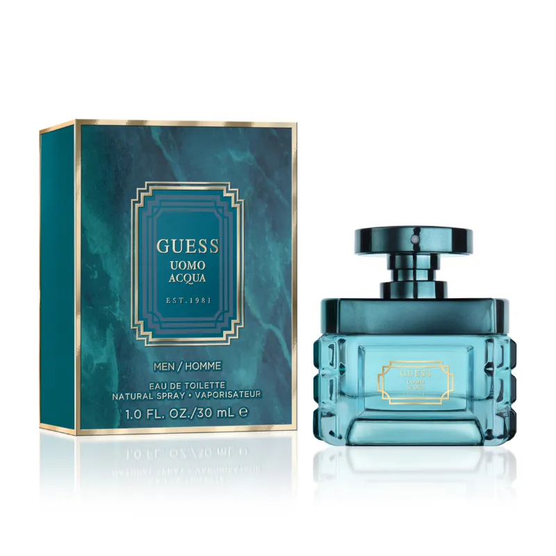 Design obalů navazuje na bohatě propracovaný design inspirovaný italskou architekturou. Elegantní modrá, mramorovaná krabička obsahuje umělecky navržený flakon z tyrkysového skla, připomínající vody Středozemního moře a logem Guess Uomo Acqua.