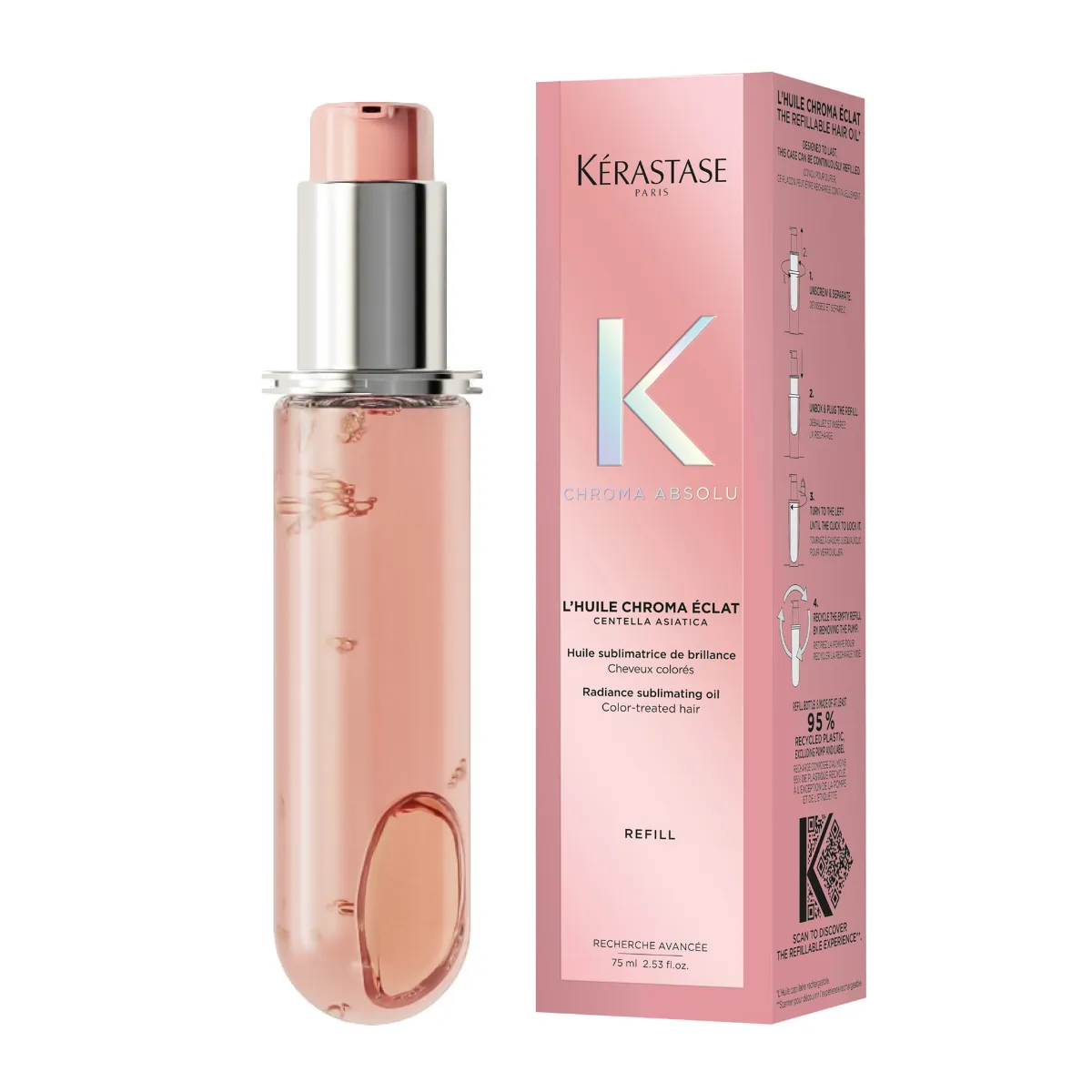 Chroma Absolu L’huile Chroma Éclat. Tento luxusní elixír zahalí vaše vlasy do hedvábného doteku, podtrhne jejich oslnivý lesk a prodlouží zářivost barvy. Složení obohacené o vzácný pupečník asijský nejen chrání barvu, ale také zanechává jemnou, podmanivou vůni, která vás bude provázet po celý den. Dopřejte svým vlasům něžnou péči, která je rozmazlí a dodá jim neodolatelnou hebkost – každý dotek bude potěšením. S touto inovativní a udržitelnou péčí přenesete profesionální krásu do svého každodenního života.