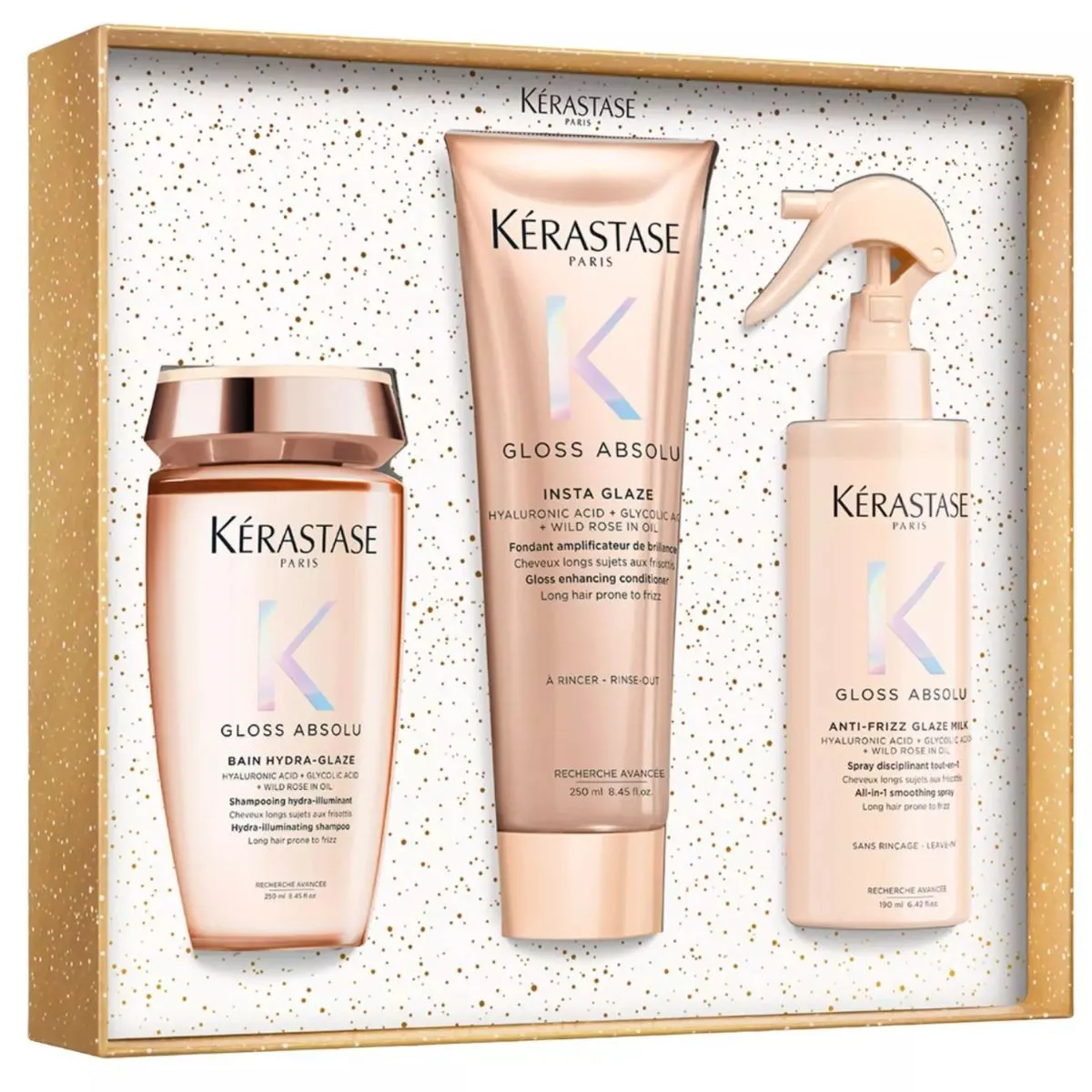 Řada Kérastase Gloss Absolu je určena pro dlouhé vlasy se sklonem ke krepatění. Díky obsahu kyseliny hyaluronové, kyseliny glykolové a oleje z divoké růže poskytuje vlasům hydrataci, lesk a pružnost bez zatížení. Pomáhá bojovat proti krepatění a dodává vlasům hladký a zářivý vzhled.