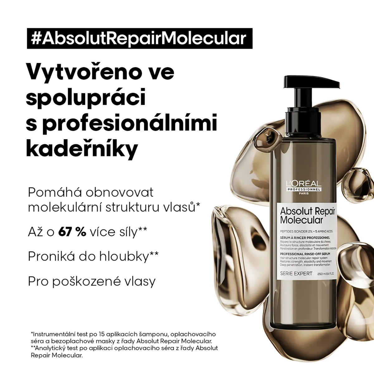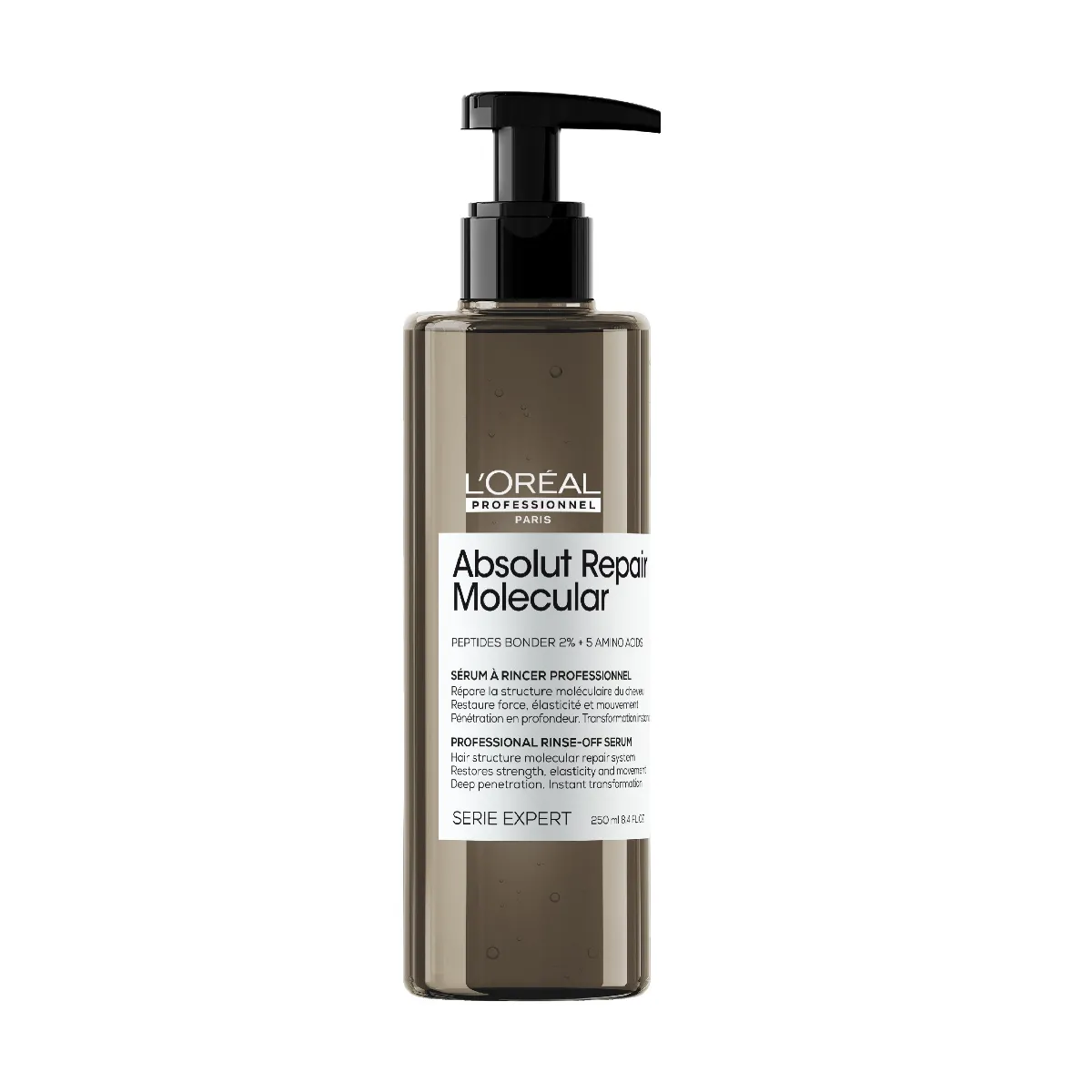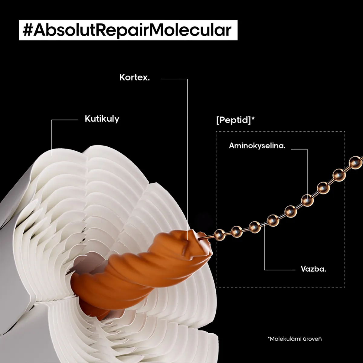 Exkluzivní koncentrované bezoplachové sérum Absolut Repair Molecular je obohaceno o 5 aminokyselin a složku Peptides bonder. Pomáhá obnovit molekulární strukturu vlasového vlákna. Tato struktura se skládá z peptidů, ale většina z nich je příliš velká, aby se do vlákna dostala z produktů.