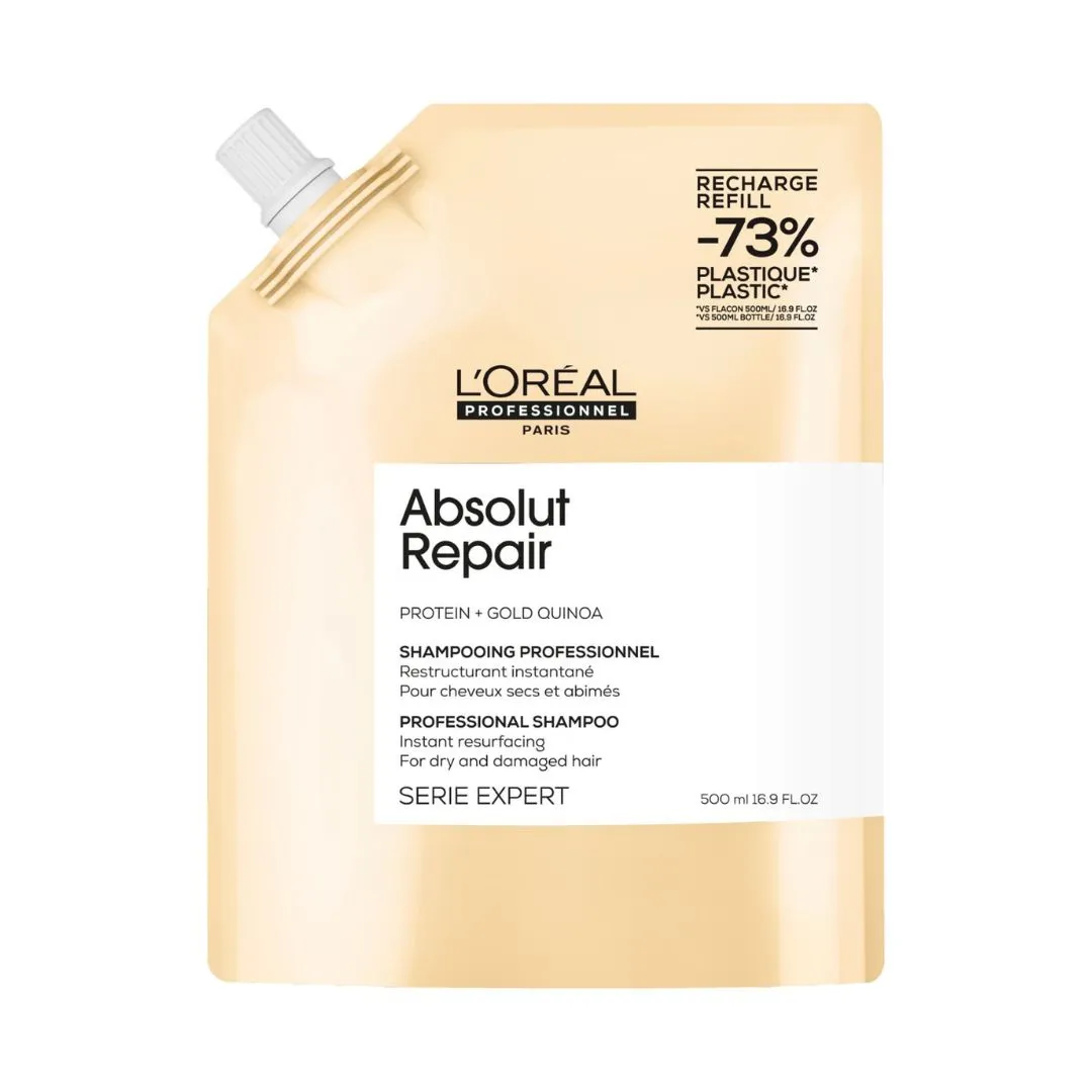 Šampon L'Oréal Professionnel Absolut Repair je ideální péčí pro suché a poškozené vlasy a vlasy zatížené chemickými úpravami. Šetrně čistí, zanechává vlasy hebké, lehké a lesklé. Viditelně regeneruje poškozený povrch vlasů, posiluje je a usnadňuje jejich úpravu. Vytváří ochranný film, který chrání před dalším poškozením.