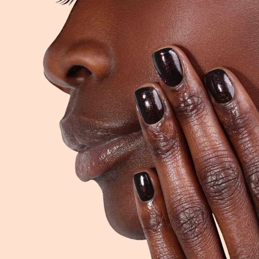 Gel lak na nehty v temně hnědém odstínu s měděnými třpytkami je inspirovaný atmosférou vintage večírků. Manikúra na 3 týdny bez toxických rozpouštědel