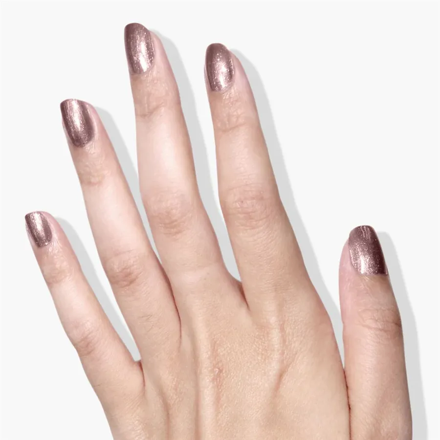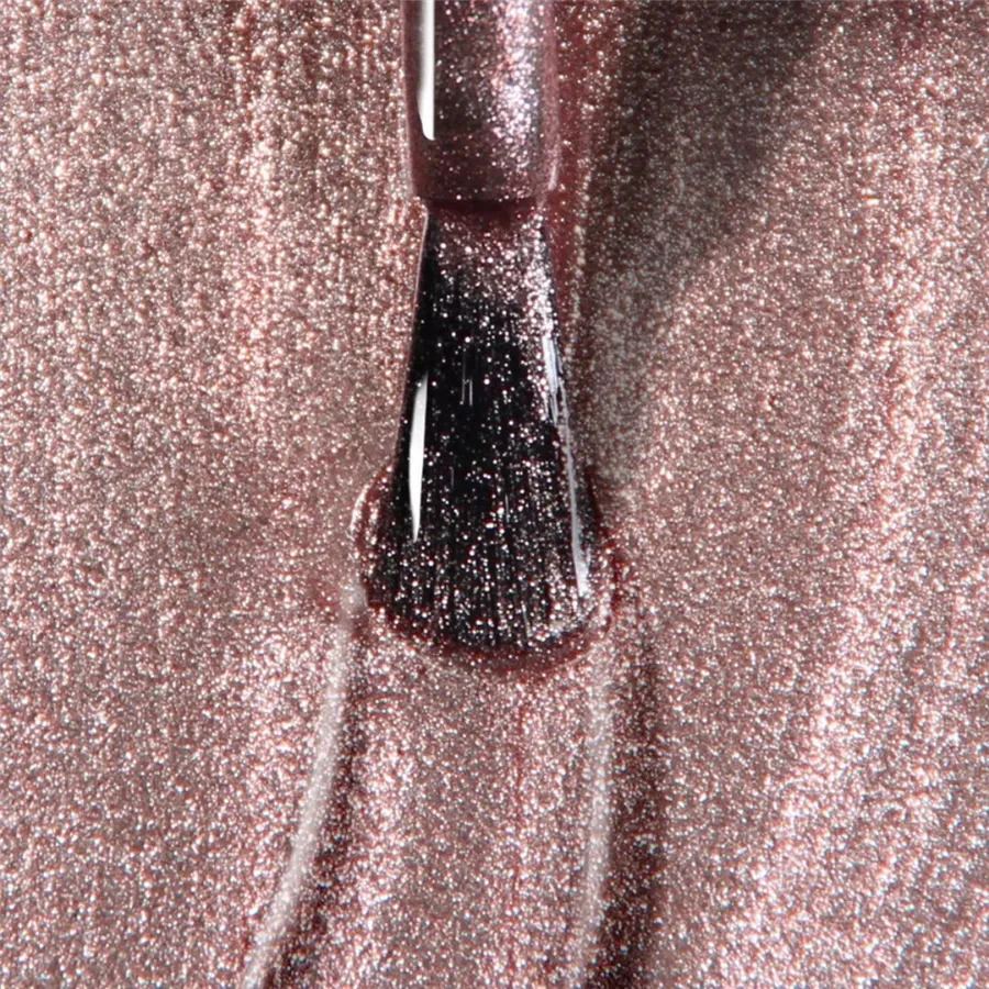 Metalický odstín růžového zlata prozáří celou dlouhou noc. Gelový lak bez toxických rozpouštědel.