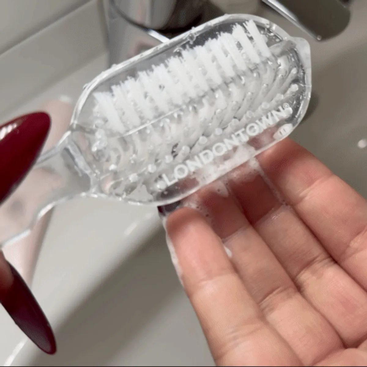 Použití: Aplikujte malé množství na nehty nebo na kartáček a vydrhněte je jemnými a rovnoměrnými krouživými pohyby. Smyjte vodou s mýdlem. Nakonec naneste Výživný olej na kůžičky od Londontown®.