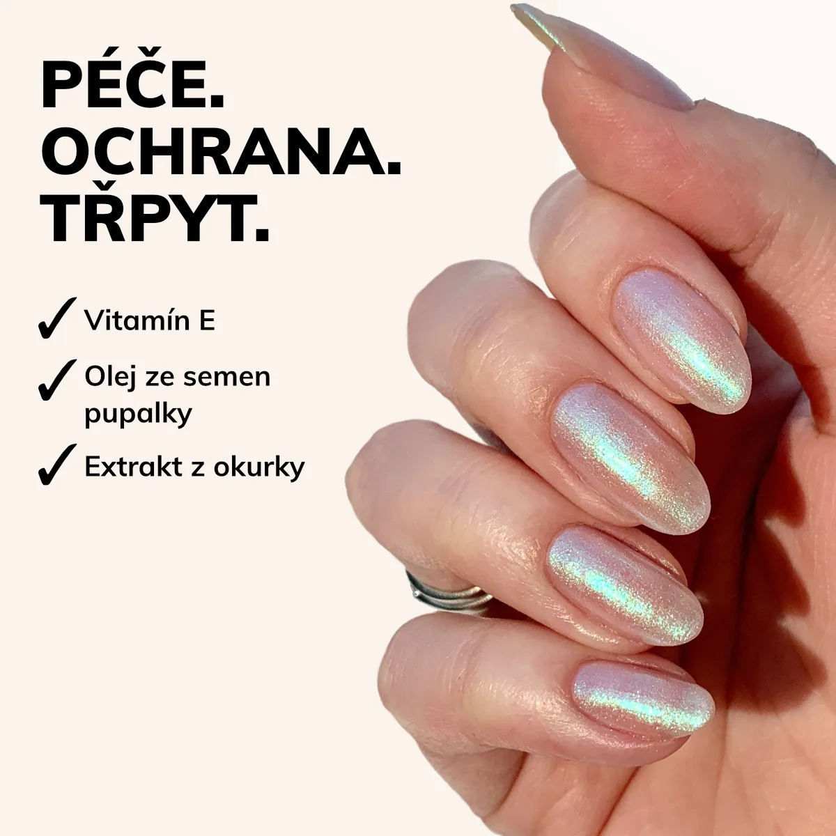 Třpytivý ochranný štít v laku na nehty zachytí každý paprsek světla. Péče a barva v jednom kroku pro dokonalou manikúru za 5 minut. Clean beauty.