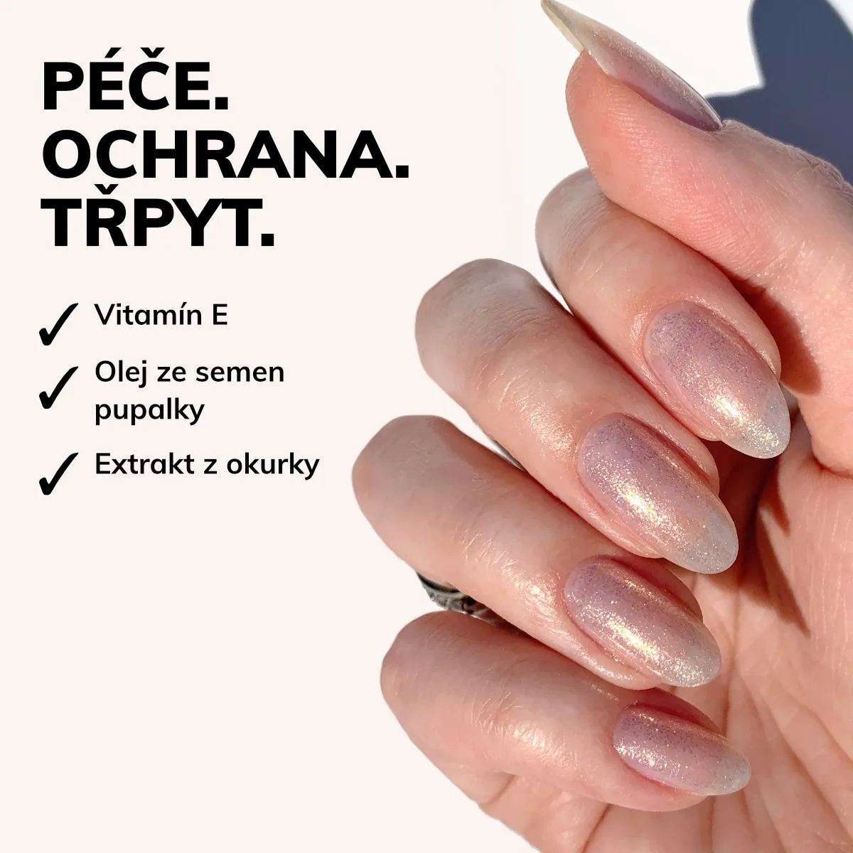 Třpytivý ochranný štít v laku na nehty zachytí každý paprsek světla. Péče a barva v jednom kroku pro dokonalou manikúru za 5 minut. Clean beauty.