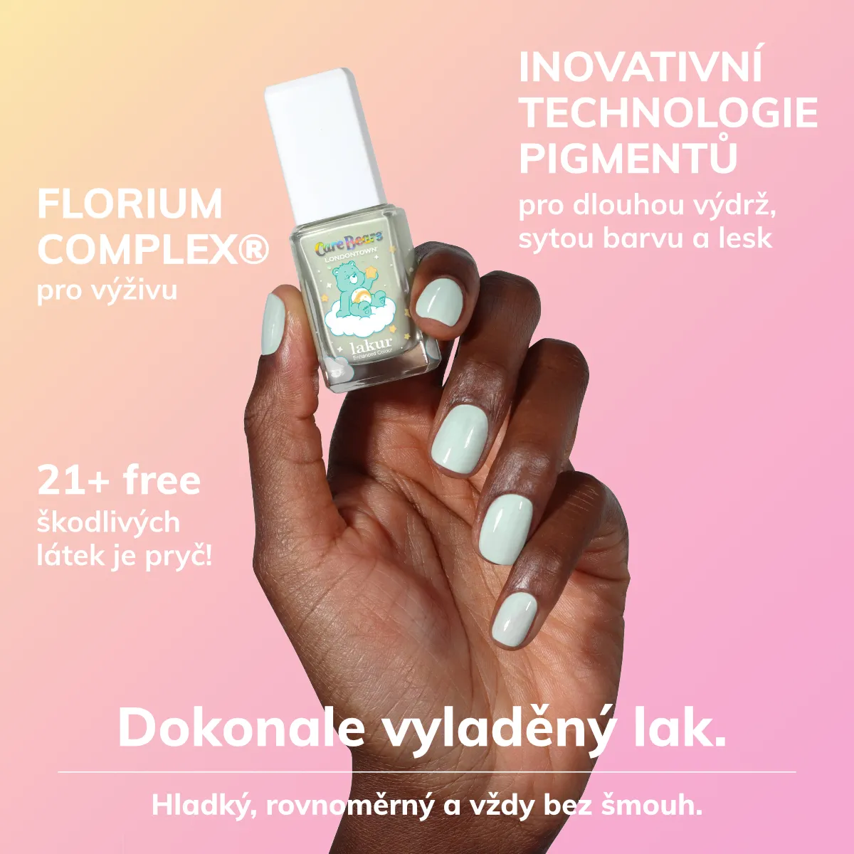 Vytvořte si manikúru pro dobrou náladu v chladivém, mátově zeleném odstínu podle medvídků Care Bears. Clean beauty.