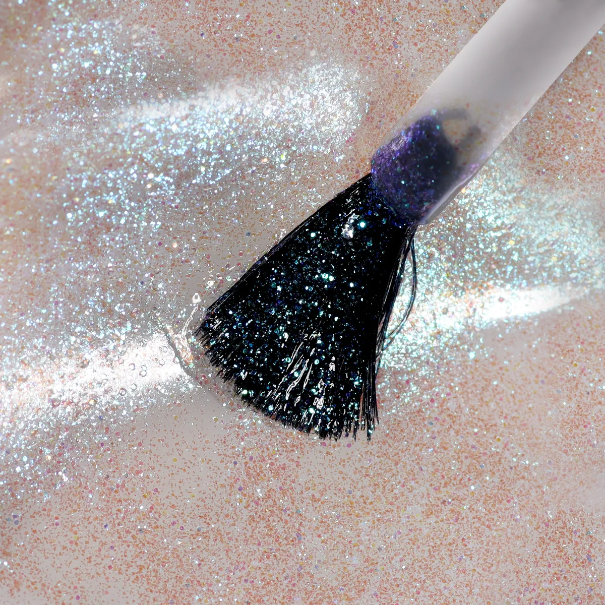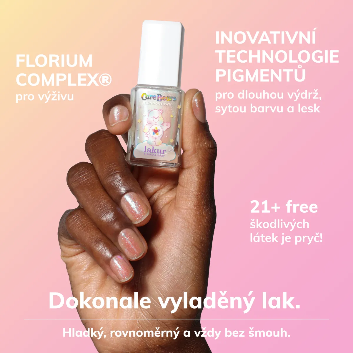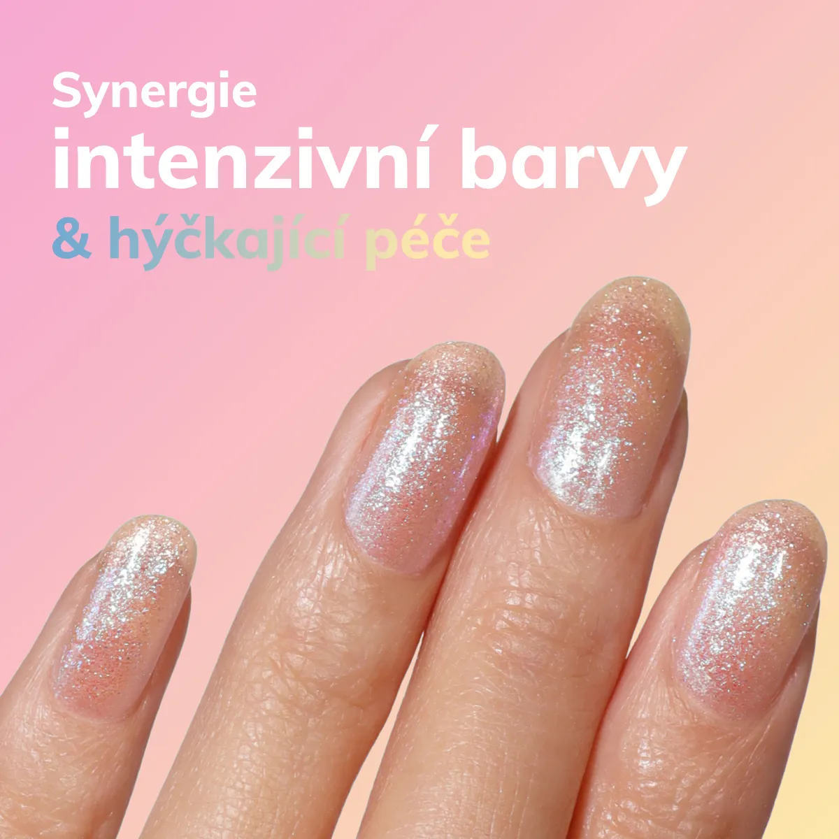 Vytvořte si manikúru pro dobrou náladu s měňavými, duhovými třpytkami plnými naděje podle medvídků Care Bears. Clean beauty.