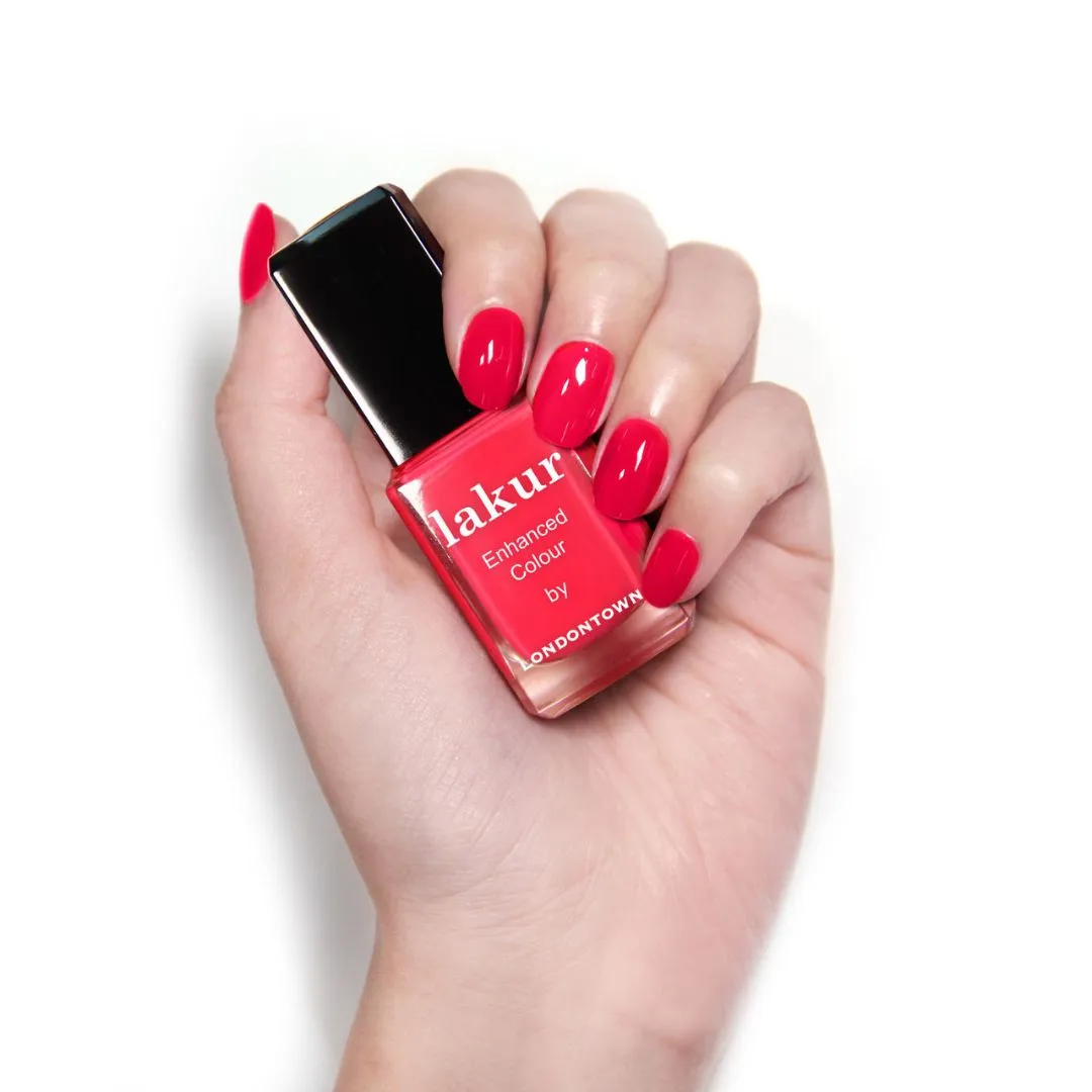 Zavolej mi, zavolej! Perfektní kombinace červené a růžové křičí tvé jméno! Lak na nehty Lakur vyživuje nehty, je veganský a 21+FREE.