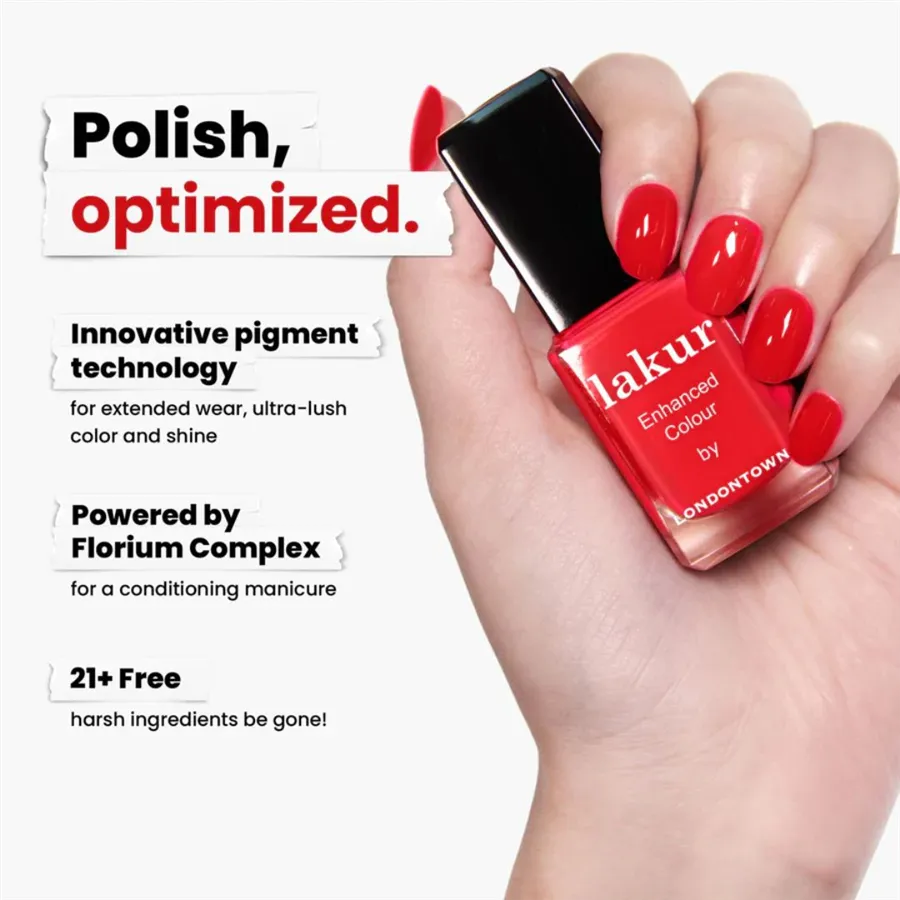 Luxusní laky na nehty Londontown lakur vyživují a zkrášlují současně, přitom jsou vysoce odolné, rychle zasychají a mají téměř gelový lesk. Obsahují Florium Complex®, dobře střežený rodinný recept - směs botanických olejů a extraktů pro posílení, hydrataci a regeneraci nehtů a pokožky. Laky na nehty lakur představují průlomovou kombinaci intenzivní barvy a jedinečné péče kur® – výsledek promyšleného přístupu, který spojuje to nejlepší z čistých ingrediencí a účinné, profesionální technologie. Vyberte si clean beauty.