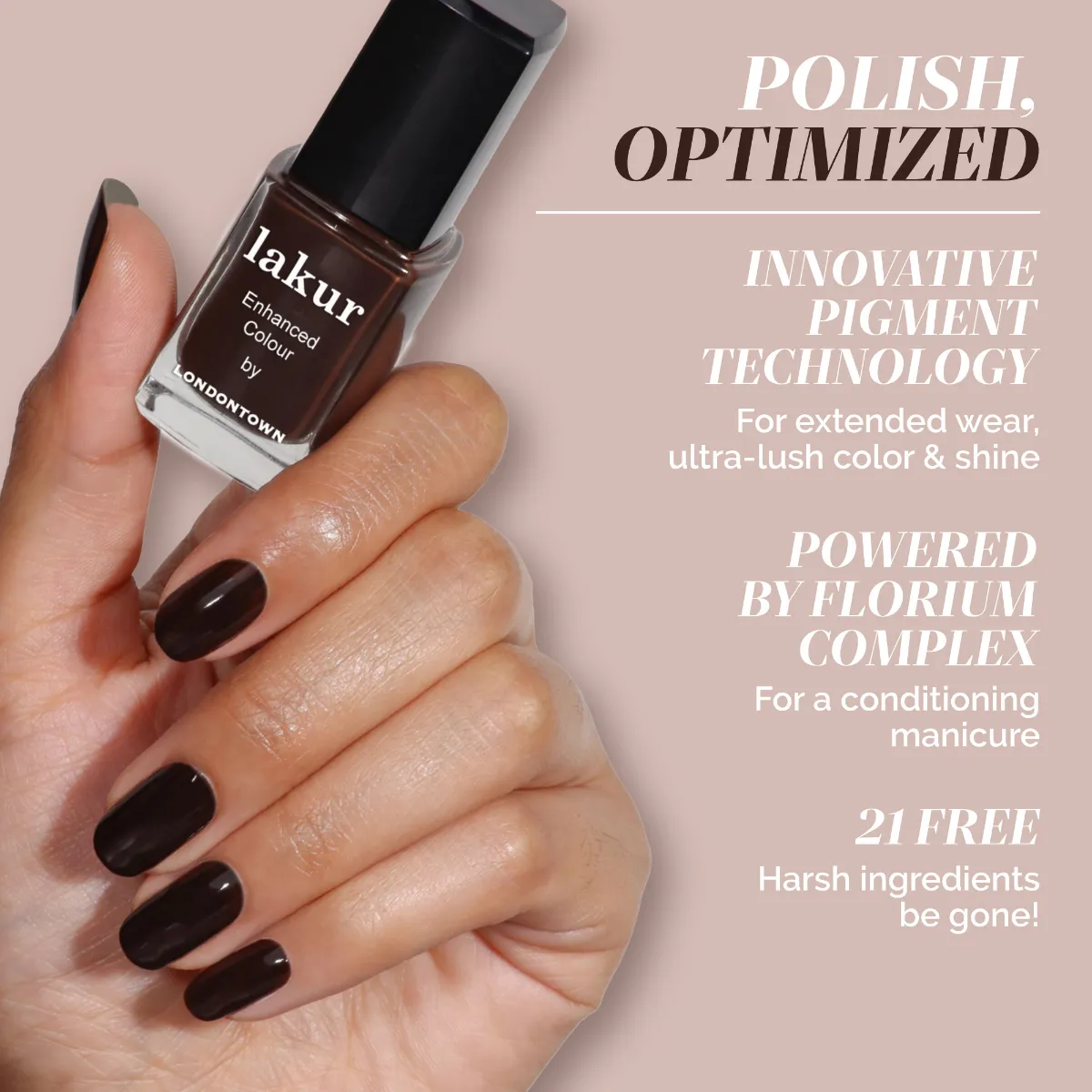 Luxusní laky na nehty Londontown lakur vyživují a zkrášlují současně, přitom jsou vysoce odolné, rychle zasychají a mají téměř gelový lesk. Obsahují Florium Complex®, dobře střežený rodinný recept - směs botanických olejů a extraktů pro posílení, hydrataci a regeneraci nehtů a pokožky. Laky na nehty lakur představují průlomovou kombinaci intenzivní barvy a jedinečné péče kur® – výsledek promyšleného přístupu, který spojuje to nejlepší z čistých ingrediencí a účinné, profesionální technologie. Vyberte si clean beauty.