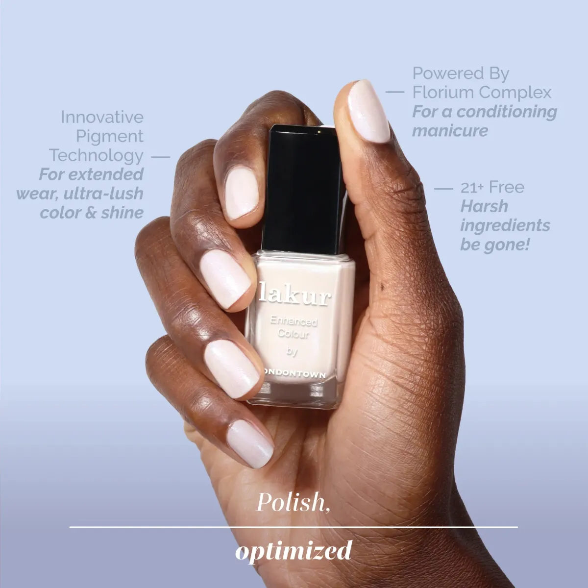Luxusní laky na nehty Londontown lakur vyživují a zkrášlují současně, přitom jsou vysoce odolné, rychle zasychají a mají téměř gelový lesk. Obsahují Florium Complex®, dobře střežený rodinný recept - směs botanických olejů a extraktů pro posílení, hydrataci a regeneraci nehtů a pokožky. Laky na nehty lakur představují průlomovou kombinaci intenzivní barvy a jedinečné péče kur® – výsledek promyšleného přístupu, který spojuje to nejlepší z čistých ingrediencí a účinné, profesionální technologie. Vyberte si clean beauty.
