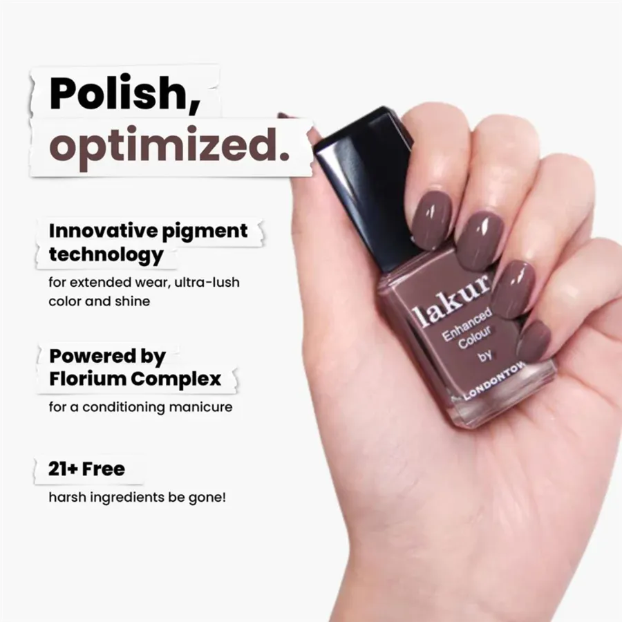Luxusní laky na nehty Londontown lakur vyživují a zkrášlují současně, přitom jsou vysoce odolné, rychle zasychají a mají téměř gelový lesk. Obsahují Florium Complex®, dobře střežený rodinný recept - směs botanických olejů a extraktů pro posílení, hydrataci a regeneraci nehtů a pokožky. Laky na nehty lakur představují průlomovou kombinaci intenzivní barvy a jedinečné péče kur® – výsledek promyšleného přístupu, který spojuje to nejlepší z čistých ingrediencí a účinné, profesionální technologie. Vyberte si clean beauty.