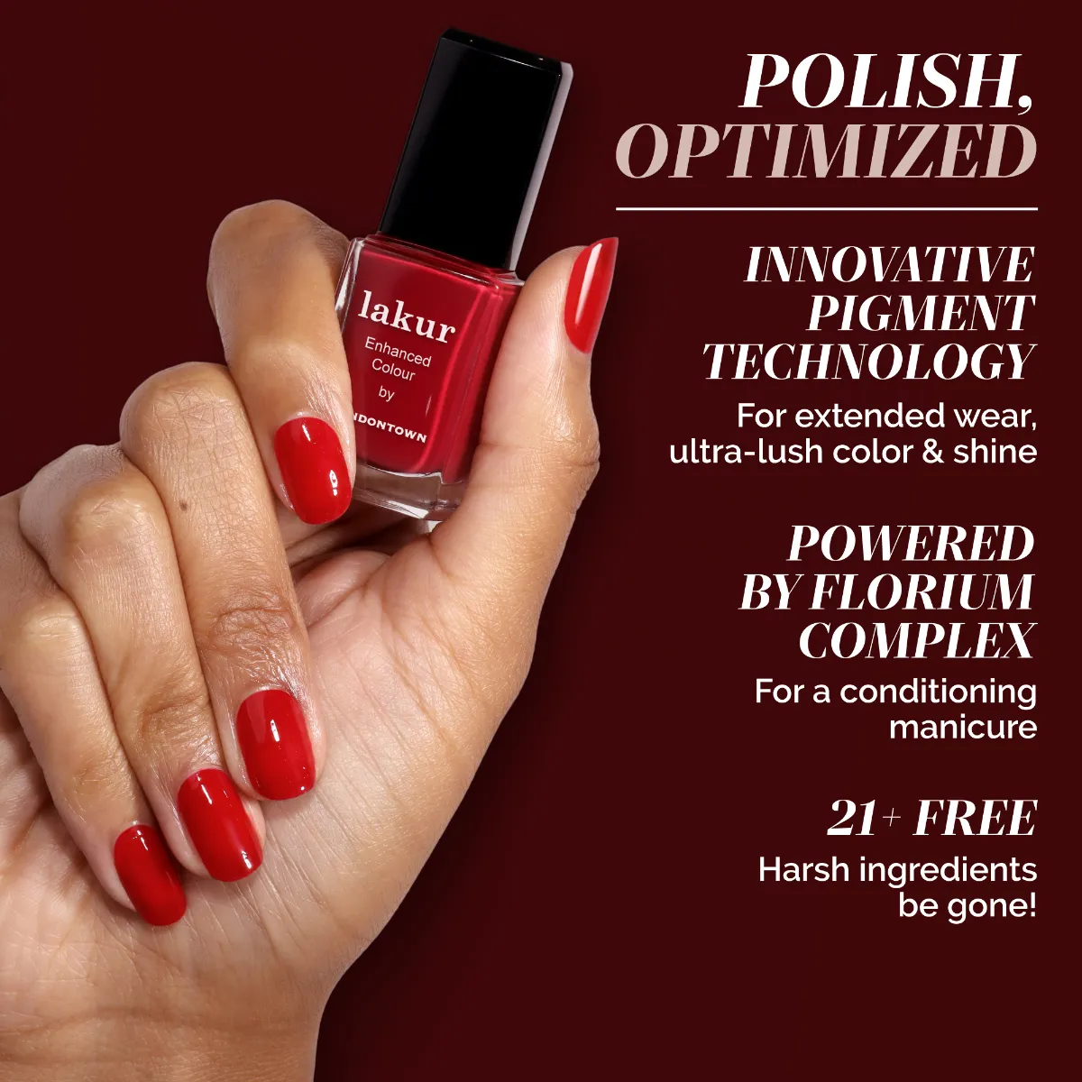 Luxusní laky na nehty Londontown lakur vyživují a zkrášlují současně, přitom jsou vysoce odolné, rychle zasychají a mají téměř gelový lesk. Obsahují Florium Complex®, dobře střežený rodinný recept - směs botanických olejů a extraktů pro posílení, hydrataci a regeneraci nehtů a pokožky. Laky na nehty lakur představují průlomovou kombinaci intenzivní barvy a jedinečné péče kur® – výsledek promyšleného přístupu, který spojuje to nejlepší z čistých ingrediencí a účinné, profesionální technologie. Vyberte si clean beauty.