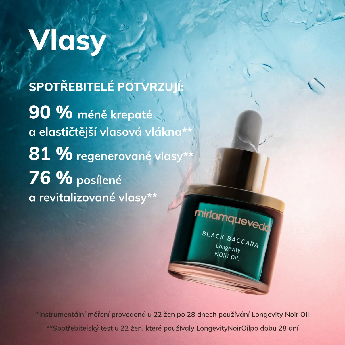Black Baccara Longevity Noir Oil od Miriam Quevedo je prémiový suchý olej určený pro celostní anti-aging péči o pleť, pokožku hlavy i vlasy. Tento elixír buněčné dlouhověkosti spojuje pokročilou biotechnologii s unikátní směsí 15 vzácných olejů a přírodních extraktů. Je navržen tak, aby působil jako anti-stresová kúra, která neutralizuje účinky kortizolu, obnovuje přirozené cirkadiánní rytmy a podporuje regeneraci buněk.