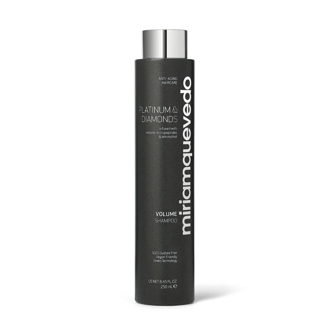 Platinum & Diamonds Volume Shampoo od Miriam Quevedo je dokonalou odpovědí na potřeby jemných a zplihlých vlasů bez života. Tento objemový šampon nejen čistí, ale zároveň transformuje vlasy pomocí inovativních technologií a vysoce účinných ingrediencí. Přináší jemným vlasům dramatický objem a extrémně hedvábnou texturu a diamantový lesk. Obsahuje 29 vzácných aktivních látek, z nichž je 45 % biotechnologického původu. Obnovuje objem zevnitř vlasového vlákna i zvenku. Vlasové pokožce i vlasům přináší péči proti stárnutí. Hydratuje, omlazuje a chrání vlasy, a to s respektem ke zdraví. Vyrovnává mikroflóru a hydrolipidovou ochrannou bariéru pokožky.