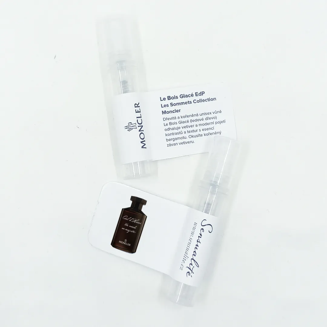 Vyberte si u nás vzorky podle libosti a do poznámky napište vůně, kterými je máme naplnit.Pokud vybranou vůni nebudeme zrovna mít, ozveme se Vám a vybereme společně jinou nebo upravíme objednávku.Upozorňujeme, že dodací doba se může o jeden den protáhnout kvůli výrobě vzorků.Kolekce luxusních vůní Moncler Collection Jejich společným rysem je autentičnost, dědictví značky a jedinečné ingredience. Zažijete s nimi intenzivní pocit pobytu na vrcholcích hor. Všechny vůně mají jednu speciální horskou ingredienci - dřevo. Tyto dřevité tóny jsou kombinovány s dalšími výjimečnými ingrediencemi a vytvářejí pět hlubokých a rozmanitých olfaktorních zážitků.Společnost Moncler byla založena v roce 1952 ve Francii. Snoubí v sobě extrémy horské přírody s požadavky městského života. Vyrábí kolekce oblečení a doplňků prostřednictvím svých butiků, exkluzivních mezinárodních obchodních domů a multibrandových míst. Co definuje značku? Unikátnost, jedinečnost, kvalita a autentičnost.