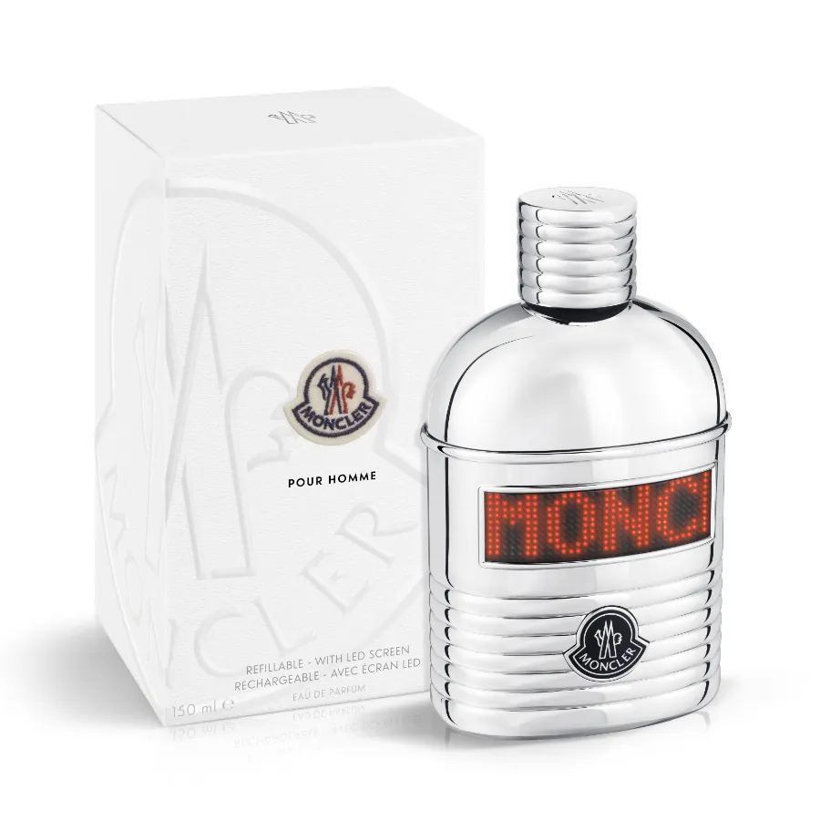Flakon v rovných liniích má odvážný stříbrný efekt a jemně zakřivený design ve tvaru "borraccia". Je obklopen žebrovaným stříbrným pouzdrem a uzávěrem. Flakon je zabalen v prémiové matné krabičce s ikonickým logem Moncler a charakteristickou nášivkou "feltrino", která připomíná nášivku na péřových bundách Moncler.
