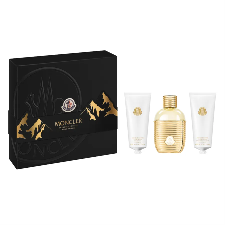 Flakon byl inspirován horami za úsvitu, kde tento nový příběh vůně využívá zářivou metaliku. Uvnitř nového oslnivého zlatého flakonu, Moncler Sunrise pour Femme vyzařuje eleganci a ženskost. Ikonický a výrazný prošívaný flakon, připomínající prošívané zimní bundy, září svým intenzivním černým obalem se symbolem domu Moncler.
