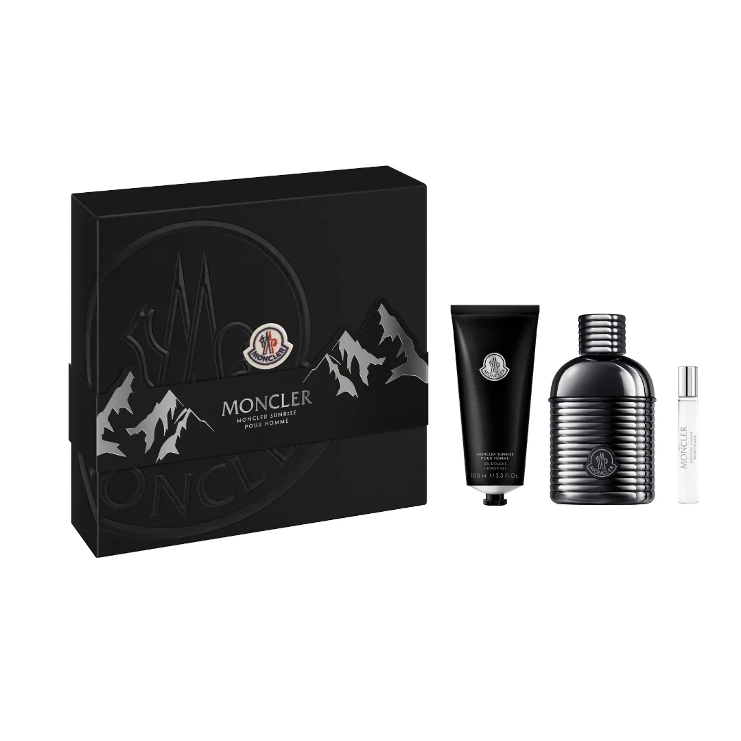 Flakon byl inspirován horami za úsvitu, kde tento nový příběh vůně využívá zářivou metaliku. Uvnitř v novém nadčasovém pistolovém kovu Moncler Sunrise pour Homme ztělesňuje esenci mužnosti, sebevědomí. Ikonický a výrazný prošívaný flakon, připomínající prošívané zimní bundy, září svým intenzivním černým obalem se symbolem domu Moncler.