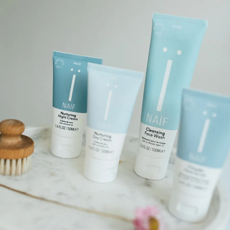 Naif je přírodní kosmetika bez nesmyslů. Tedy bez nesmyslných ingrediencí jako jsou minerální oleje, parabeny, PEG a syntetická pěnidla, SLS / SLES, fenoxyethanol, chemické konzervanty, esenciální oleje či jiné potenciálně škodlivé nebo alergenní látky. Obsažený parfém nezpůsobuje alergie. Vytvořili ji dva tatínkové pro svá rozkošná miminka, děti a nakonec i ženy. Z lásky a s péčí. Buďte naivní!