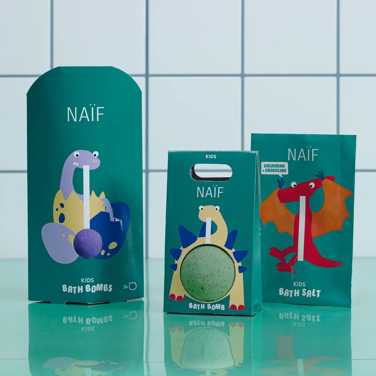 NAÏF Bomby do koupele jsou vyrobeny z přírodních ingrediencí respektující citlivost dětské pokožky. Šumivý efekt vzniká při reakci jedlé sody s kyselinou citronovou. Obsahují přírodní rostlinná barviva antokyany, které dodávají vodě fialovou barvu. Součástí složení je i slunečnicový olej pro hebkou a vyživenou pokožku. Po koupeli bude pokožka dětí hydratovaná, jemná a hebká.