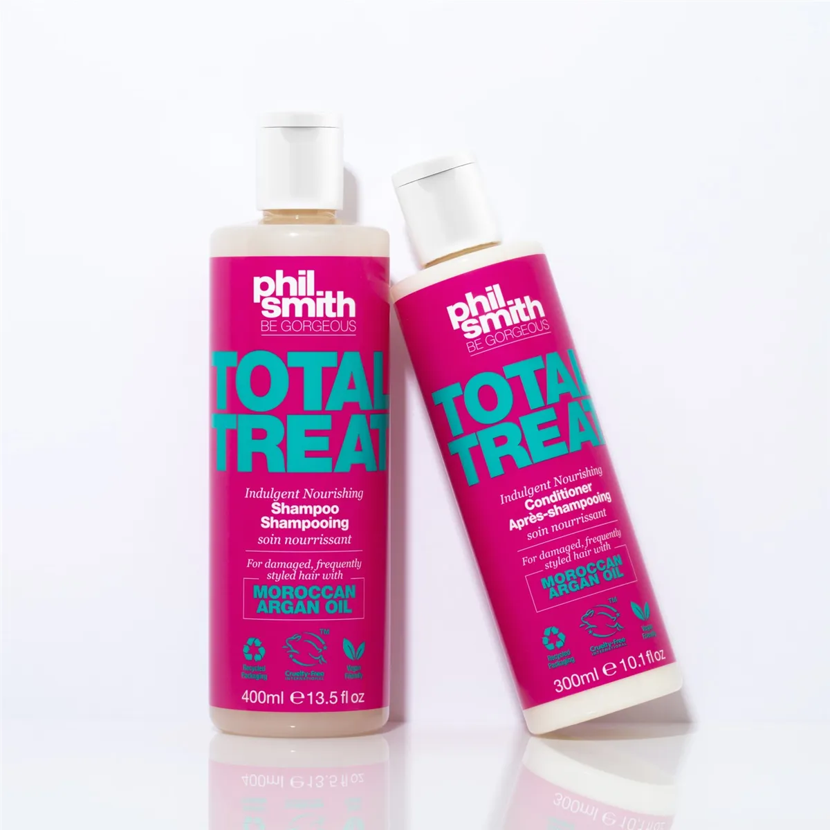 Kondicionér Phil Smith Be Gorgeous Total Treat zachrání poškozené a suché vlasy. Marocký arganový olej pomáhá vlasy znovu vyživovat a navíc je chrání před poškozením teplem. Vaše vlasy navíc budou zářivě lesklé a hebké. Připravte se zazářit! S řadou Total Treat řeknete jednou provždy sbohem suchým a poškozeným vlasům. Je skvělá pro barvené vlasy. Chrání je před tepelným poškozením a dodá jim zářivý lesk.