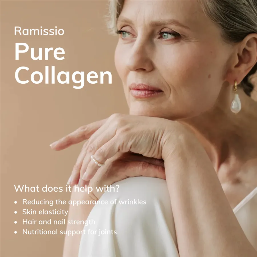 Kolagenový nápoj Pure Collagen Ramissio je jako opravdový elixír krásy a mládí. Tento kolagenový doplněk stravy je dokonale čistý. Obsahuje jen hydrolyzovaný mořský kolagen z ryb s hmotností pouhých 2000 Da. Je přirozeně neutrální, bez sladidel a příchutí. Dokonale se propojí s jakýmkoli nápojem či pokrmem, aniž by narušil jeho chuť. Jednoduše ho přimíchejte do svého oblíbeného rituálu a nechejte ho tiše pracovat ve prospěch vaší krásy.