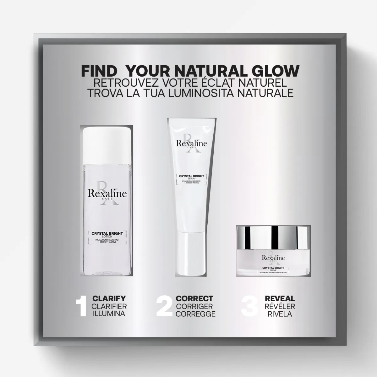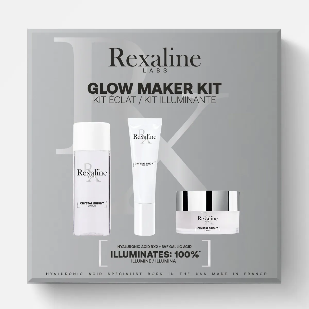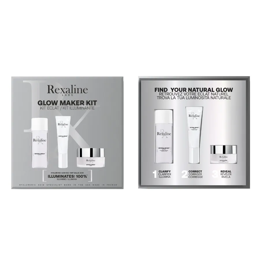 Cestovní set pro rozjasněnou pleť obsahuje pečující produkty z řady Crystal Bright. Duální kyselina hyaluronová, která je součástí složení všech produktů Rexaline, přináší intenzivní dávku hydratace ve všech vrstvách pleti. Viditelně vyhlazuje vrásky a navrací pleti pružnost. Rozjasňuje a odstraňuje nepříjemné pocity pnutí, které jsou jedním ze základních projevů dehydratace. Produkty řad Crystal Bright dále obsahují komplex 3Bright (kyselinu gallovou).