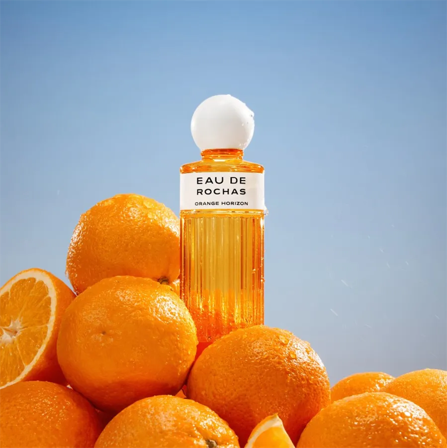 Elegantní a moderní flakon, tónovaný do popové a jiskřivé oranžové barvy, překrucuje ikonické kódy Eau de Rochas do barevné, rozhodně moderní deklamace.