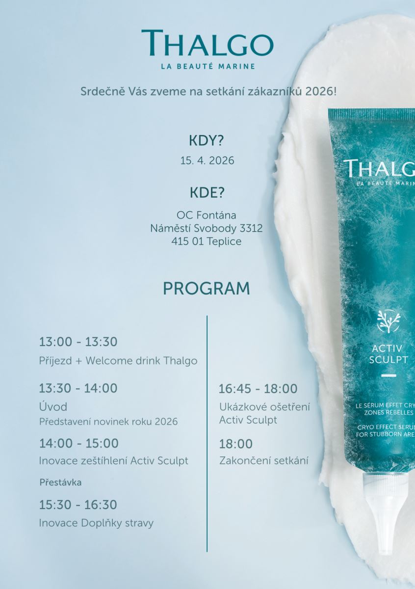 Srdečně Vás zveme na setkání zákazníků Thalgo 2026, které se uskuteční 15. dubna 2026 v OC Fontána, Teplice v salonu Angely Kacarské.