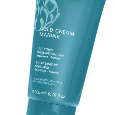 Tělové mléko z řady Cold Cream Marine (24h Hydrating Body Milk) přináší intenzivní hydrataci, která vydrží až 24 hodin. Fyziologická náprava dehydratované pleti byla dermatologicky prokázána.* Dodává pleti sametový závoj, pružnost a jemnost. Vstřebává se tak rychle, že se můžete okamžitě oblékat. Má sladkou a svěží vůni broskví, zeleného listí a bílého pižma.