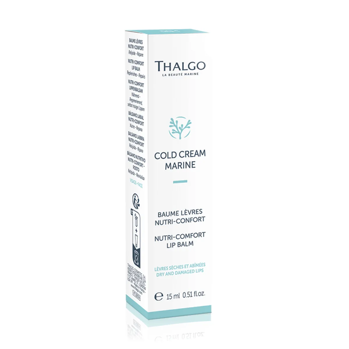 Nutri-Comfort výživný balzám na rty Thalgo Cold Cream Marine s obsahem posíleného vyživujícího komplexu a mořského pro-ceramidu doplňuje lipidy, přináší suchým rtům intenzivní výživu a komfort. Obnovuje kožní bariéru stimulací syntézy ceramidů. Rty jsou hladší, jemnější a méně popraskané. Balzám obohacený o koncentrát bambuckého másla redukuje popraskání, zvlhčuje suché, poškozené rty a podporuje hojení. „Mast“ s bohatou, nelepivou, rozplývající se texturou má jemnou unisexovou vůni s tóny ambry a vanilky. Zahalí rty pocitem jemnosti. Zkosená tuba je praktická na nošení s sebou a aplikaci kdykoli během dne.