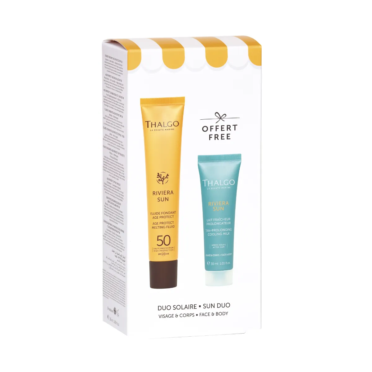 Dopřejte své pokožce kompletní letní péči v jednom výhodném balení. Duo Riviera Sun spojuje vysokou ochranu před sluncem s následnou regenerační péčí, která prodlužuje opálení a udržuje pleť krásnou, hydratovanou a zářivou po celé léto. Opalovací krém Riviera Sun SPF 50 poskytuje vysokou ochranu proti UVA a UVB záření a zároveň působí proti známkám stárnutí. Díky moderním organickým filtrům chrání pokožku šetrně a efektivně, aniž by zatěžoval mořský ekosystém. Obsahuje středomořské řasy bohaté na karotenoidy a antioxidanty, které pomáhají udržet pleť pružnou, sjednocenou a svěží. Aloe vera a kyselina hyaluronová zajišťují intenzivní hydrataci a zklidnění. Po slunění přichází na řadu zklidňující mléko Riviera Sun, které pokožku okamžitě osvěží, regeneruje a zároveň prodlužuje opálení. Díky vysokému podílu přírodních složek intenzivně hydratuje a pomáhá udržet pokožku hebkou a komfortní. Aloe vera podporuje hydrataci a červená mikrořasa Porphyridium cruentum stimuluje tvorbu melaninu, čímž napomáhá k intenzivnějšímu a dlouhotrvajícímu opálení. Oba produkty mají lehkou, rychle se vstřebávající texturu bez mastného filmu. Opalovací krém zanechává efekt „nahé pleti“, zatímco chladivé mléko poskytuje okamžitý pocit svěžesti. Jemné letní vůně podtrhují smyslový zážitek z aplikace. Použití: Opalovací krém aplikujte před každým pobytem na slunci a pravidelně obnovujte, zejména po koupání, osušení nebo pocení. Po slunění naneste zklidňující mléko na obličej i tělo a opakujte podle potřeby pro zachování hydratace a prodloužení opálení. Thalgo je francouzská značka inspirovaná mořem, která využívá sílu mořských řas a minerálů pro účinnou a přirozenou péči o pleť i tělo.