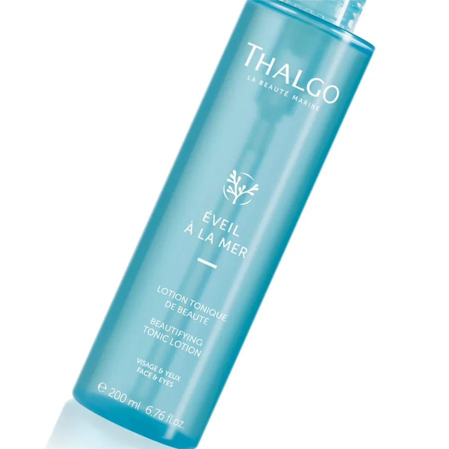 Zkrášlující pleťové tonikum Thalgo Éveil a la Mer šetrně a důkladně odstraňuje nečistoty a zbytky make-upu z pleti a očí. Povzbuzuje a rozjasňuje. Je vhodné pro všechny typy pleti včetně citlivé. Filtrát patentovaných Mikronizovaných mořských řas dodává pleti minerály a mikroživiny, které jsou nezbytné pro její správné fungování. Pleť revitalizuje a posiluje. Rostlinný glycerin pleť hydratuje a změkčuje. Zamezuje ztrátě vody a tím udržuje optimální hydrataci.