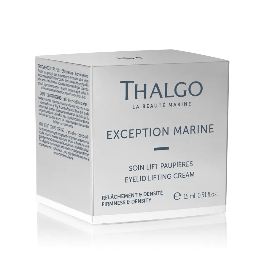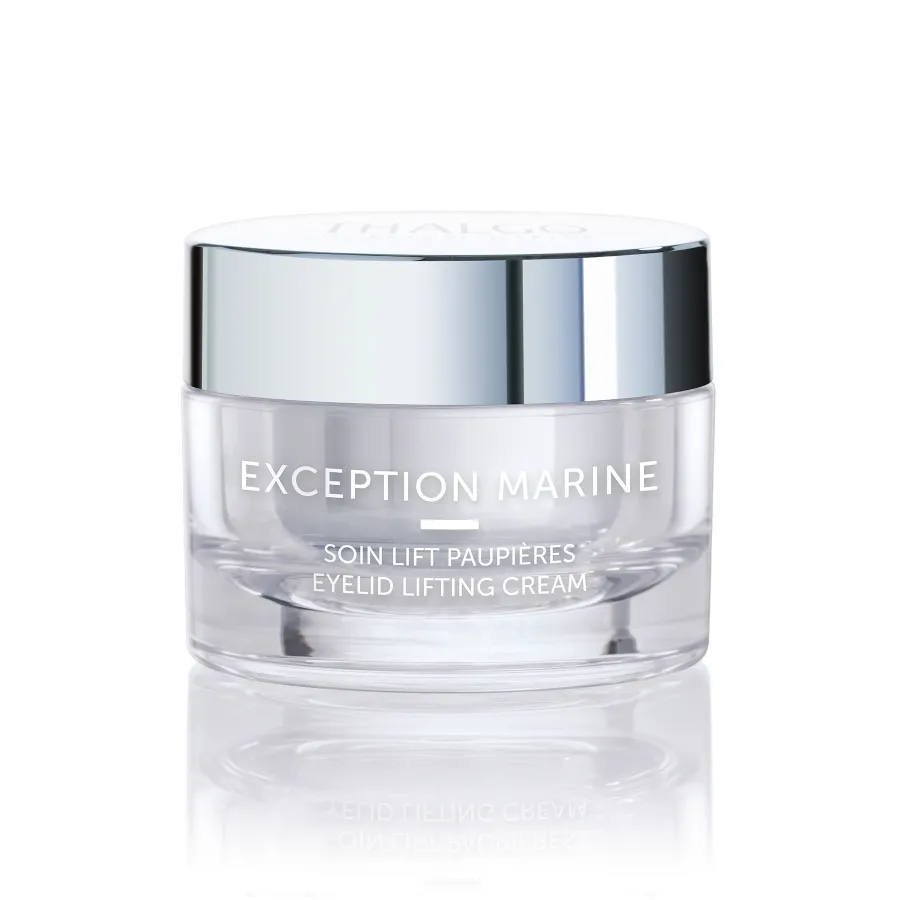 Thalgo Exception Marine Liftingový krém na oční kontury zvyšuje pevnost a hustotu povadající pleti. Má okamžitý a dlouhotrvající efekt. Napravuje vrásky, tmavé kruhy a otoky kolem očí. Má příjemnou, krémovou texturu. Kromě patentovaného komplexu Marine Replenishment Complex® pro zpevnění a hustotu obsahuje extrakt z ovsa vysoce koncentrovaný na cukr, který má okamžitý zpevňující efekt. Dále směs koňského kaštanu a melilotu, které redukují tmavé kruhy a otoky.
