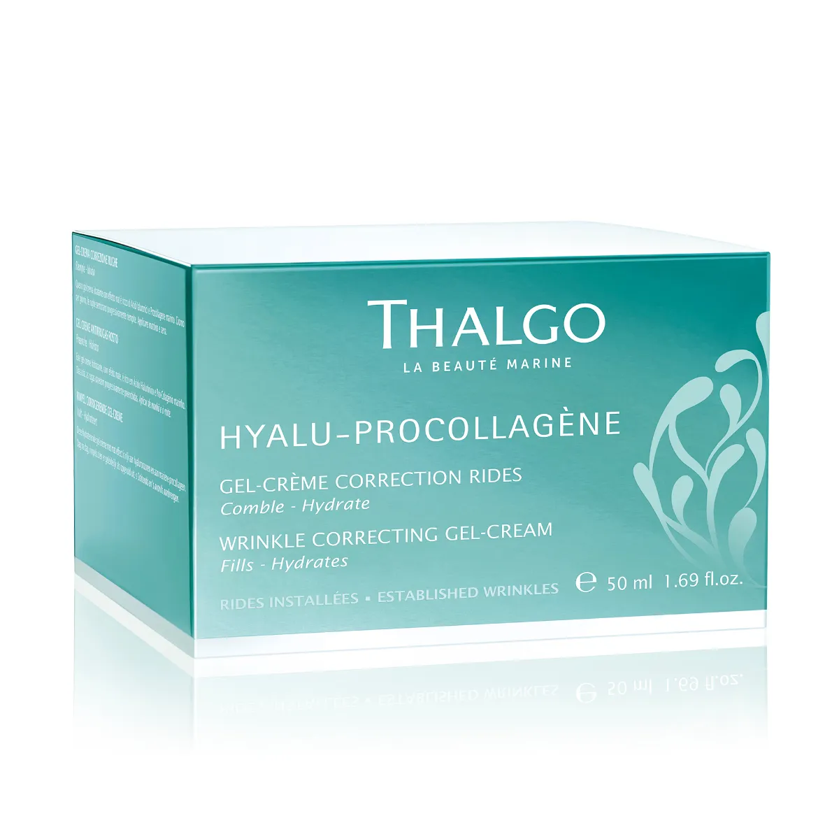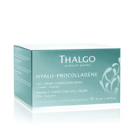 Gelový krém pro nápravu vrásek Thalgo Hyalu-Procollagene má trojitou účinnost proti vráskám. Kombinace tří kyselin hyaluronových a mořského pro-kolagenu pleť okamžitě vypíná, viditelně vyhlazuje vrásky a postupně vyplňuje i hluboké vrásky zevnitř. Gelový krém je obohacený o koktejl rostlinných aktivních látek (algináty a aloe vera), které doplňují do pleti vodu a intenzivně hydratují. Jeho lehká fluidní textura se snadno vstřebává a je ideální pro normální až smíšenou pleť.
