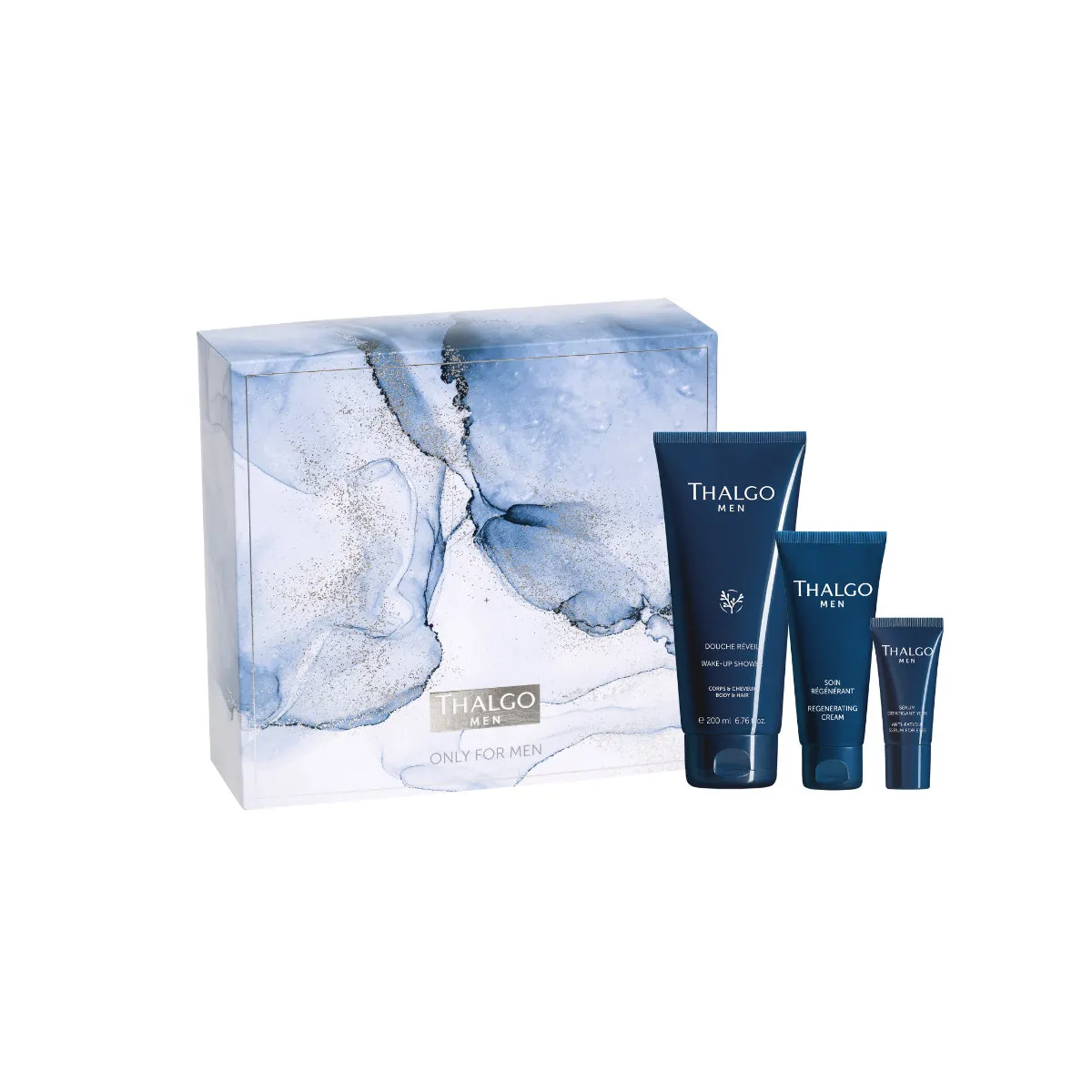 Thalgo3525801706540THGT240369NXI000101Dárkový set s regeneračním krémem, sérem pod oči a sprchovým gelem pro kompletní péči o mužskou pleť.