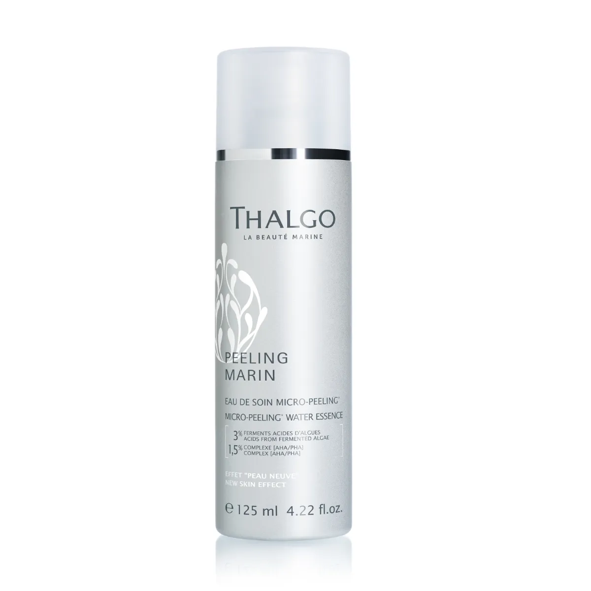 Mikropeelingová vodní esence Peeling Marin vyhlazuje pleť a zjemňuje její strukturu. Má povrchový exfoliační účinek pro každodenní použití. Obnovuje pleť postupně díky důmyslné progresivní mikroexfoliaci. Obsahuje kyseliny z fermentovaných řas (3 %) a komplex AHA a PHA kyselin (1,5 %). Esence má svěží vodnatou, lehce gelovou texturu s mořskou vůní. Je vhodná pro všechny typy pleti. Nevysušuje. Je určena na domácí použití a nemusíte ji kombinovat s ošetřením Peeling Marin.