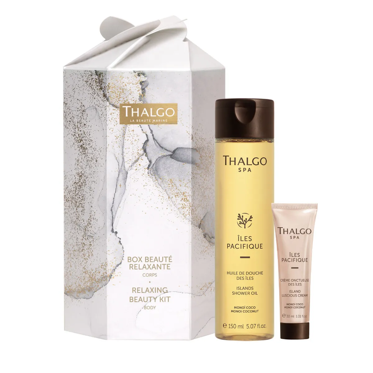 Set tělové kosmetiky obsahuje:Îles Pacifiques Sprchový olej 150 mlÎles Pacifiques Sametový tělový krém 30 mlPoužití: Naneste sprchový olej na vlhkou pokožku, jemně masírujte a opláchněte. Poté aplikujte tělový krém na suchou pokožku.Řada Îles Pacifiques je inspirovaná exotickými ostrovy a přináší smyslnou vůni, která navozuje pocit pohody a dovolené. Spojuje jemné textury a výživné složky, které pokožku hýčkají a dodávají jí komfort i během zimního období.Thalgo je přírodní kosmetika z mořských řas a minerálů pro přirozenou a účinnou péči o vaši pleť a tělo.