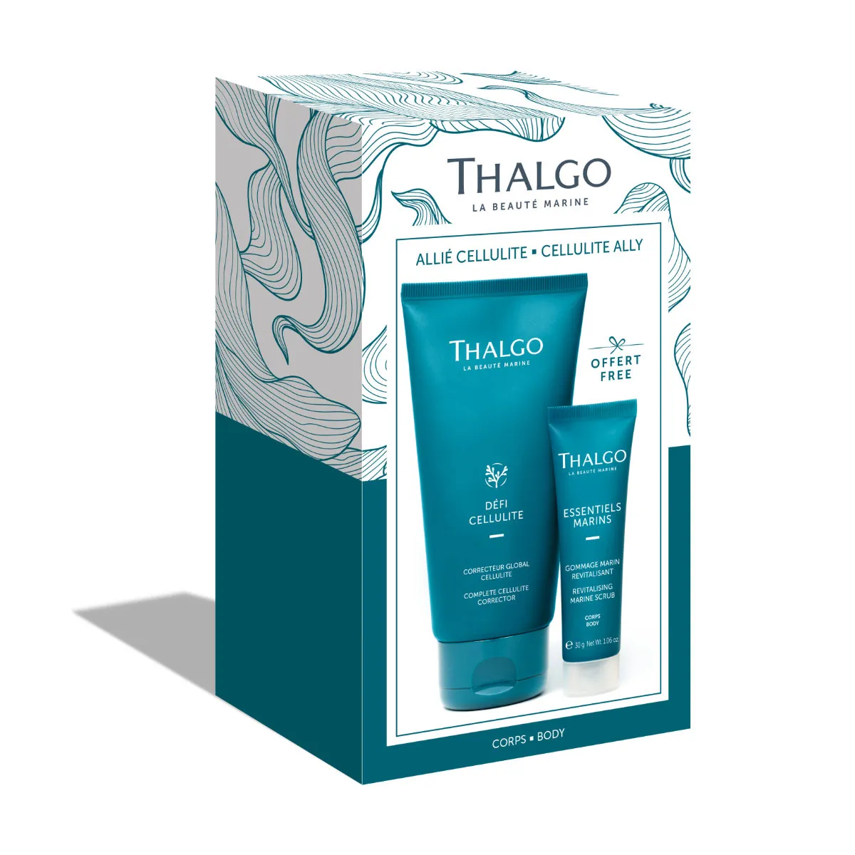 Svěží gel na celulitidu Expert Correction for Stubborn Cellulite Thalgo je prvním korektorem na neústupnou celulitidu. Okysličuje tkáně a účinně odstraňuje lokalizované zásoby tuku. Působí jako kosmetický "by-pass" a viditelně redukuje celulitidu po 14 dnech. Způsob fungování je přímo inspirován chirurgickými úkony.Má především tyto dva účinky: zkracuje trasu kanálů pro ukládání tukových buněk. Oxy-aktivní technologie s 15 x vyšší dávkou rostliny coleus forskohlii vytvoří jakýsi "by-pass" receptorů, které spouští ukládání tuků. Tím přímo aktivuje lipolýzu. Dalším účinkem je masivní vypuzení neústupných tukových zásob. Látka piperin z pepře zvyšuje účinky coleus forskohlii až 11 x. Zvyšuje propustnost povrchu pleti a viditelně podporuje lipolytickou aktivitu. Rychle se vstřebává a zanechává pokožku suchou.Použití: aplikujte ráno a večer anti-celulitidními masážními tahy a poklepy na problematické partie.V srdci revitalizačního tělového peelingu je kultovní patent značky Thalgo - Mikronizované mořské řasy® (viz níže) s detoxikačními, remineralizačními a regeneračními účinky. Dále obsahuje řasu chondrus crispus obohacenou o zvlášňujicí agenty, díky které je pokožka hydratovaná, jemná a pružná. Díky exfoliačním částicím o dvou velikostech (křemen a celulóza) můžete peelingem dokonale odstraňovat odumřelé buňky a vyhladit texturu pokožky. Osvěžení přináší obsažený mentol. Má velmi svěží mořskou vůni a texturu, která připomíná ledový sorbet.Použití: nanášejte na suchou nebo navlhčenou kůži a masírujte krouživými pohyby. Zaměřte se na hrubá místa (lokty, kolena, chodidla). Po použití pečlivě smyjte. Používejte 1 – 2 x týdně.Thalgo je přírodní kosmetika z mořských řas a minerálů pro přirozenou a účinnou péči o vaši pleť.